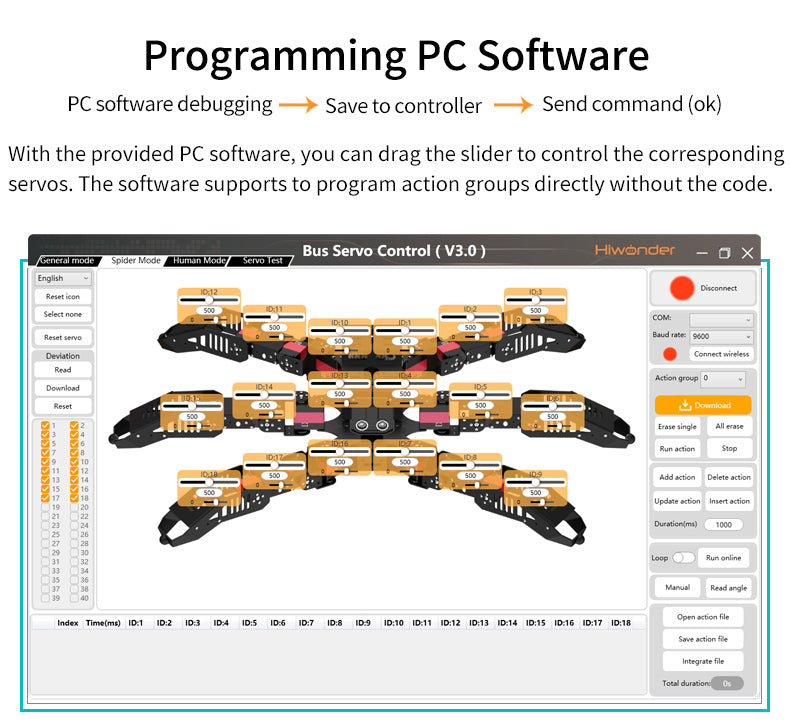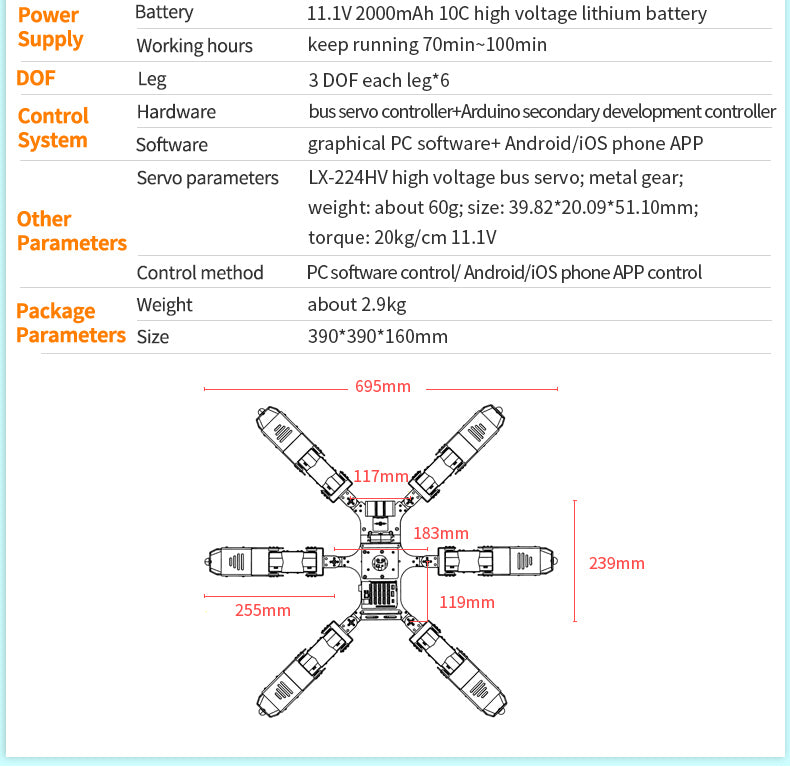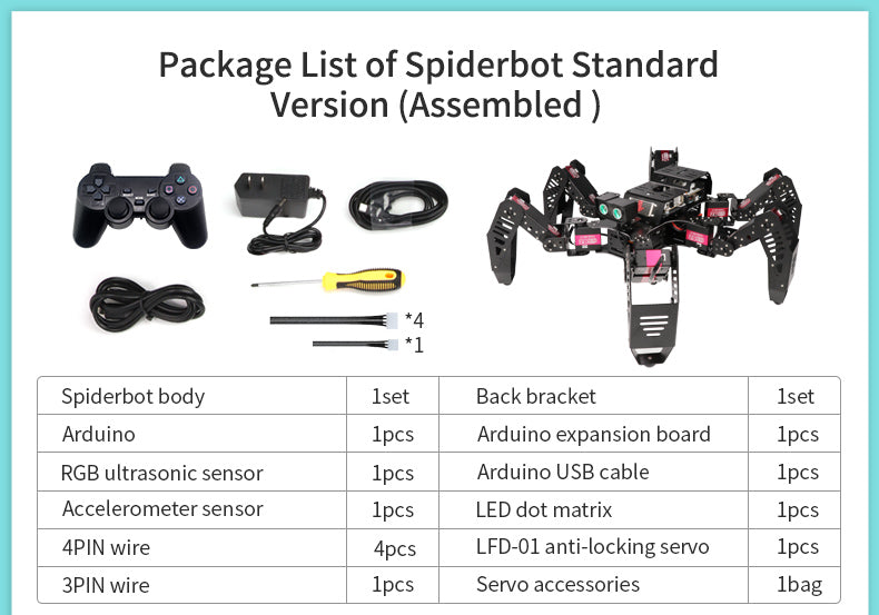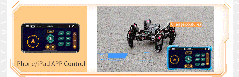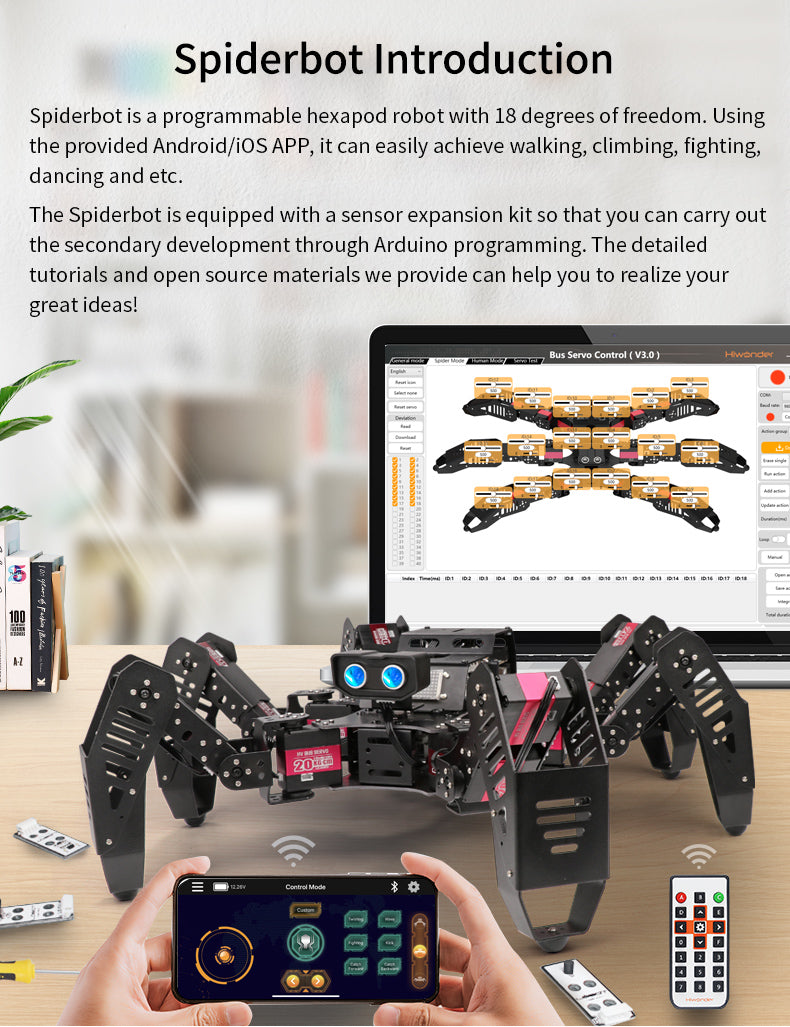 Spiderbot-это программируемый робот-гексаод с 18 степенями свободы. С помощью приложения Android/iOS, он может легко достичь ходьбы, скалолазания, бокса, танцев и т. д.