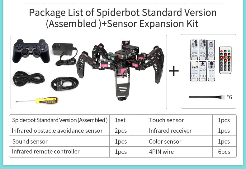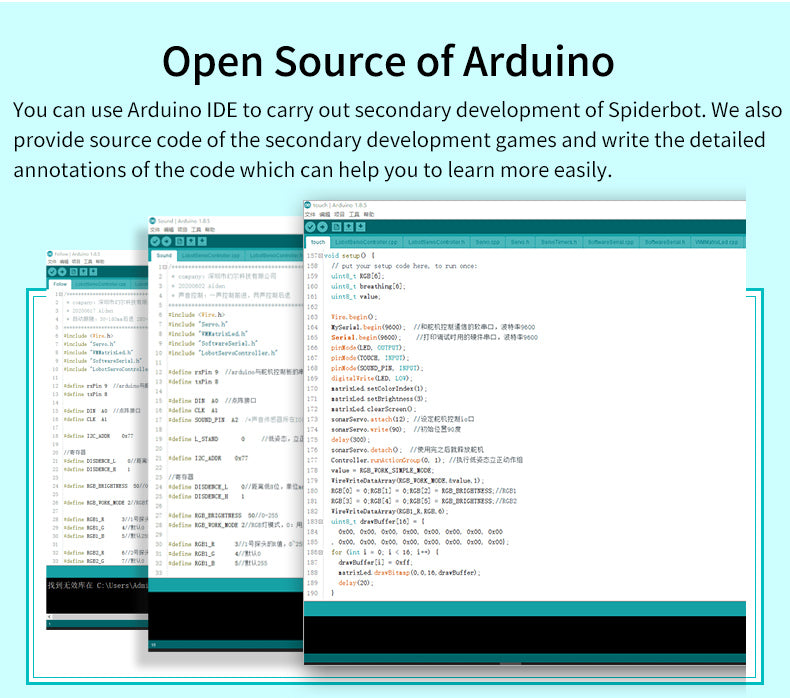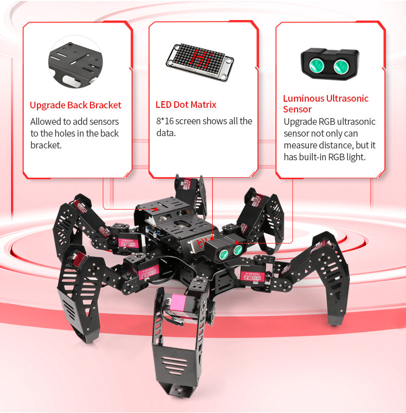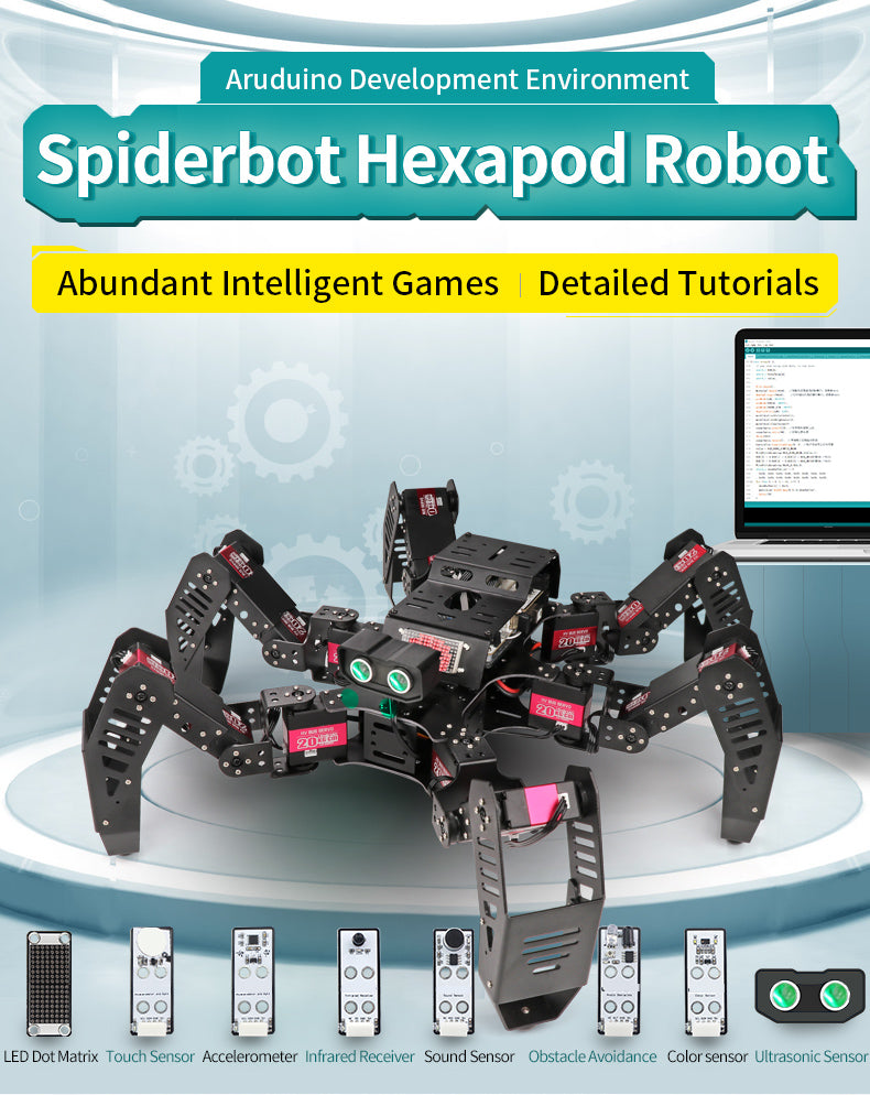 Spiderbot оснащен набором расширения датчика, чтобы вы могли осуществлять вторичную разработку через Программирование Arduino. Подробные обучающие материалы и материалы с открытым исходным кодом помогут Вам воплотить ваши замечательные идеи!
