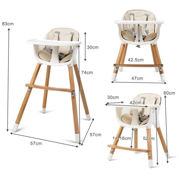 Размер упаковки: 43,5*35,5*31,5 см, вес брутто: 5,9 кг, материал: высококачественная дужка бука + сиденье PP + подушка из искусственной кожи, Максимальная грузоподъемность: 15 кг, подходит для детей до 6 месяцев до 3 лет, размер пластины: 42х30 см (длина * ширина), Размер модели с высокой стопой: 83*57*57 см, (два вида деревянных стульев с регулируемой высотой), размер модели с низкой стопой: 60*45*45 см
