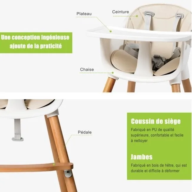1. Конструкция-трансформер 2-в-1-стульчик можно свободно переключать между стульчиком и низким стульчиком; Педаль и ужин также можно регулировать в двух положениях, стремясь улучшить комфортное сидение разных детей (конструкция 2 в 1 может обратить внимание на изменения ваших детей, когда они вырастут)