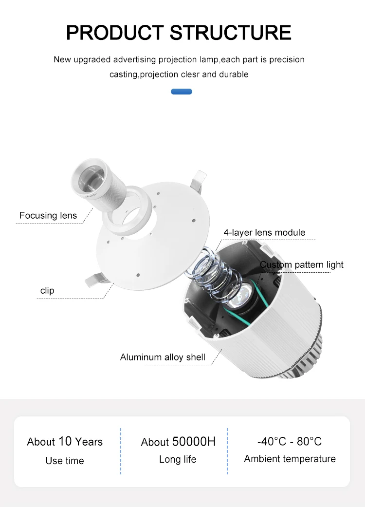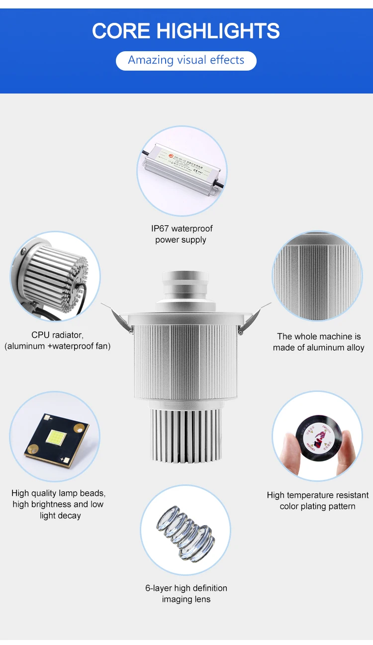 1. Yufan прямые продажи с фабрики, цена и качество гарантированы 2. Лампа для проектора с индивидуальным узором 3. Зеленый и экологически чистый, низкое энергопотребление 4. Различные узоры могут быть настроены в соответствии с потребностями пользователя. 5. Изготовлен из алюминиевого сплава, высокое качество и долгое время работы