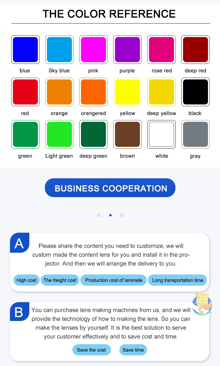 Проектор должен использоваться с объективом gobo, поэтому, пожалуйста, приобретайте проектор и объектив gobo вместе. Затем отправьте ваш индивидуальный логотип файлы (AI / CDR/JPG/ПСД/PNG) в наш адрес электронной почты: chenhaiyi@yufane.com Наконец, мы установим линзы логотипа в проектор zhe и отправим вам.