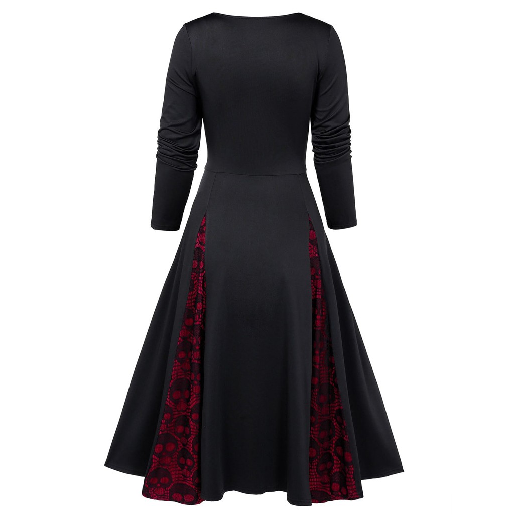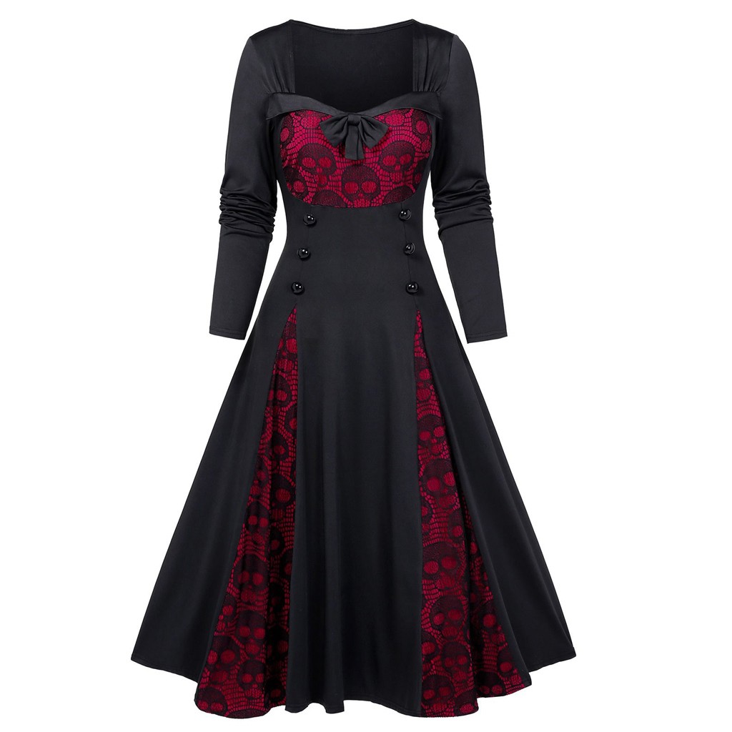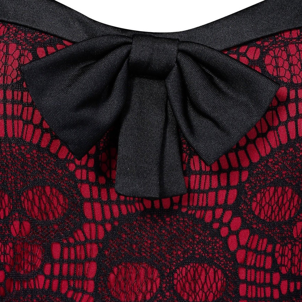 Women Plus Size Halloween Skull Lace Insert Mock Button Bowknot Dress