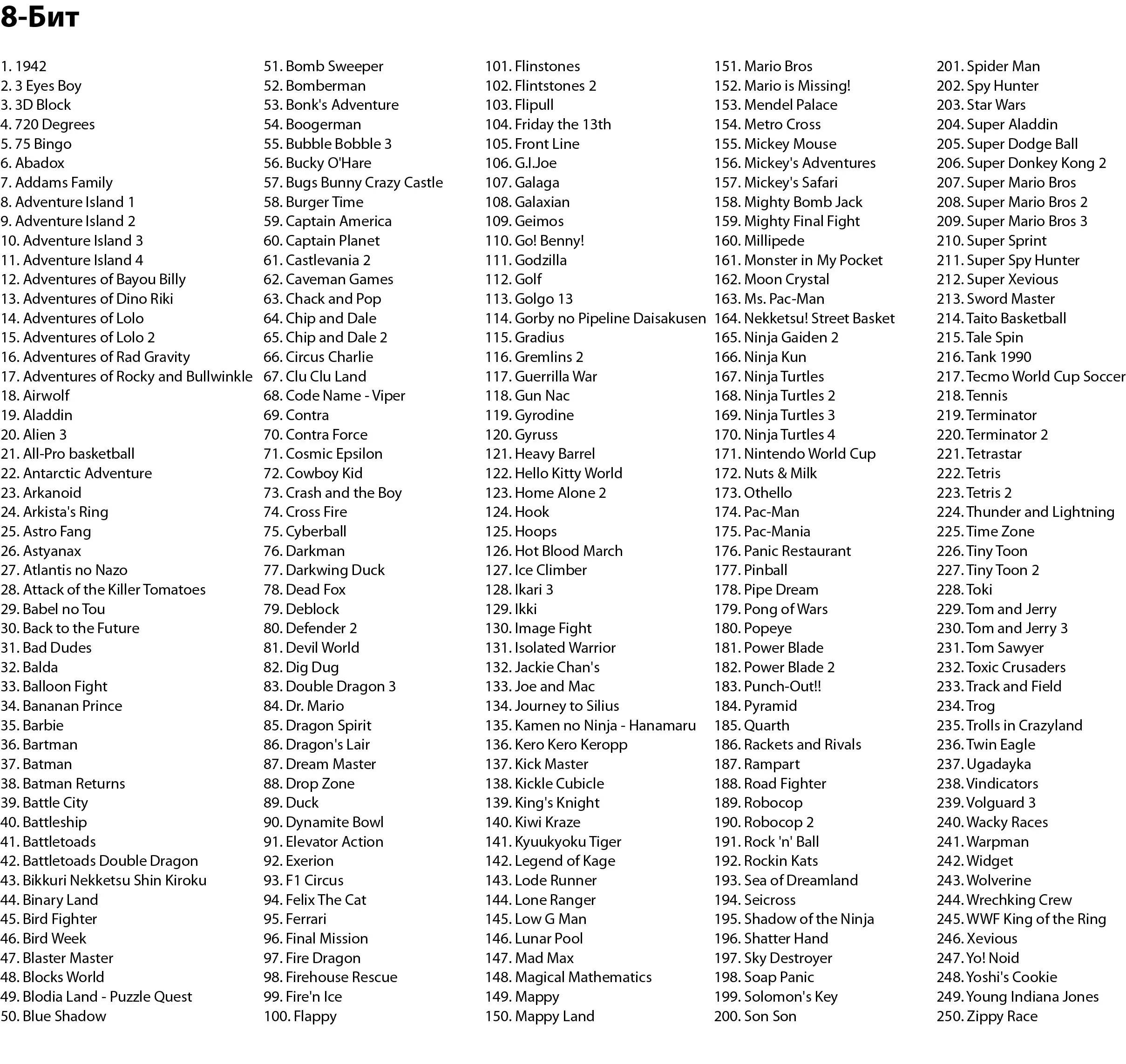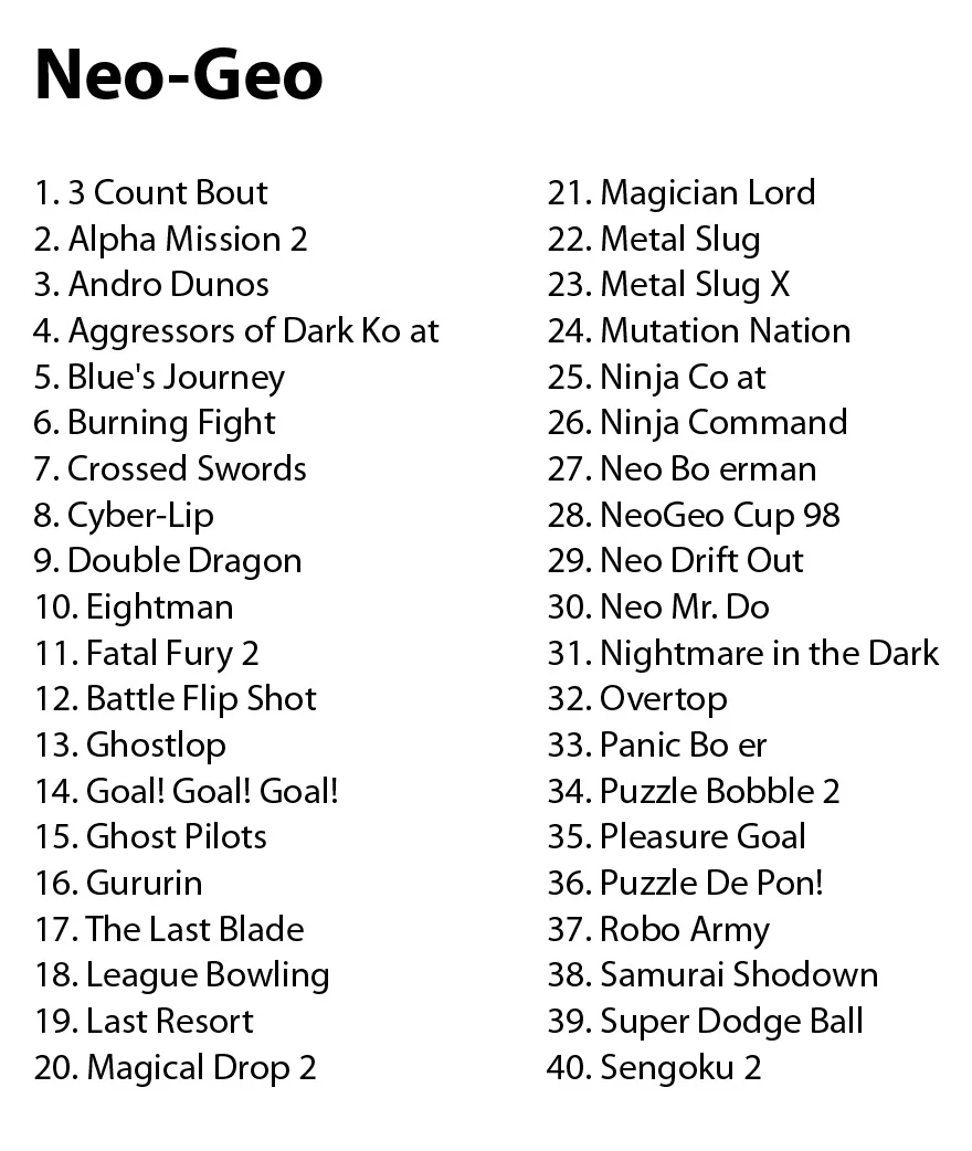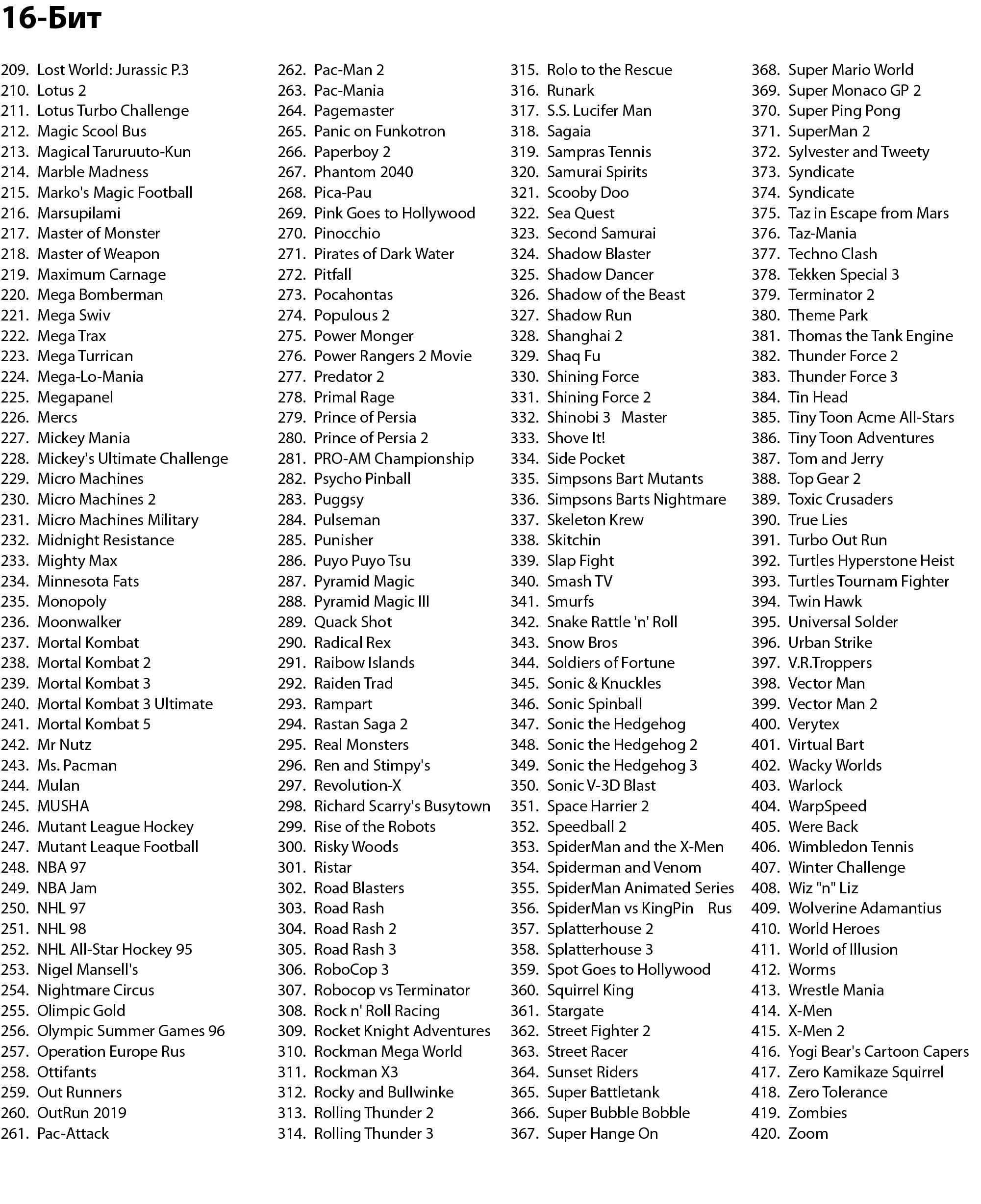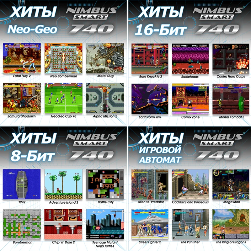 В приставке соединены игры 8-бит (250шт), 16-бит (420шт), игры Neo-Geo (40шт) и MAME (30шт). Всего - 740 игр.
