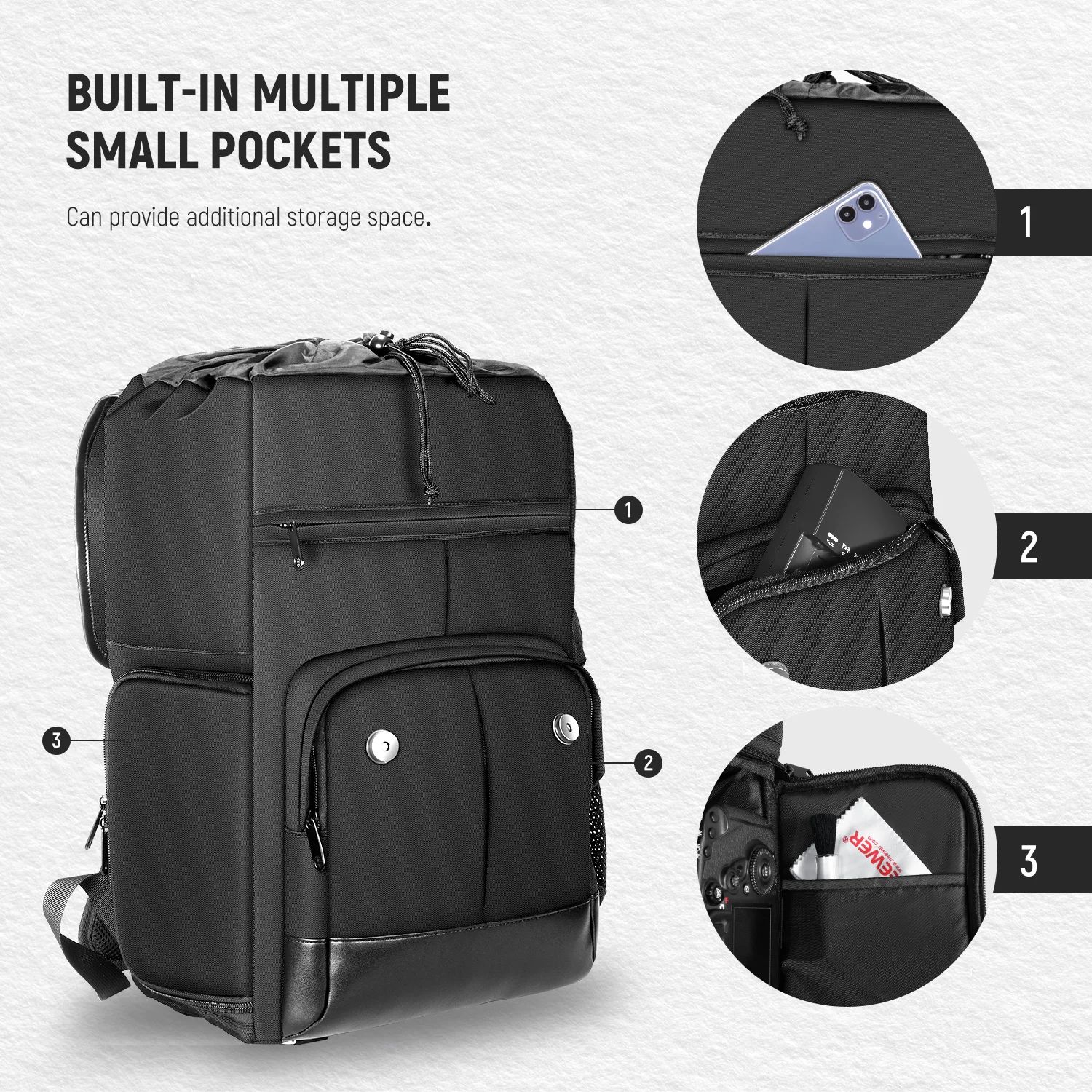 Универсальная сумка для камеры: внутри и снаружи рюкзака есть небольшие отделения для аксессуаров для быстрого извлечения вещей. Для внешней части, сумка для хранения на правой стороне рюкзака оснащена гибкой фиксирующей пряжкой, которые можно затянуть, когда вы размещаете один или несколько длинных продуктов, чтобы предотвратить их падение или россыпь. Дождевик входит в комплект, обеспечивая одностороннюю Водонепроницаемость