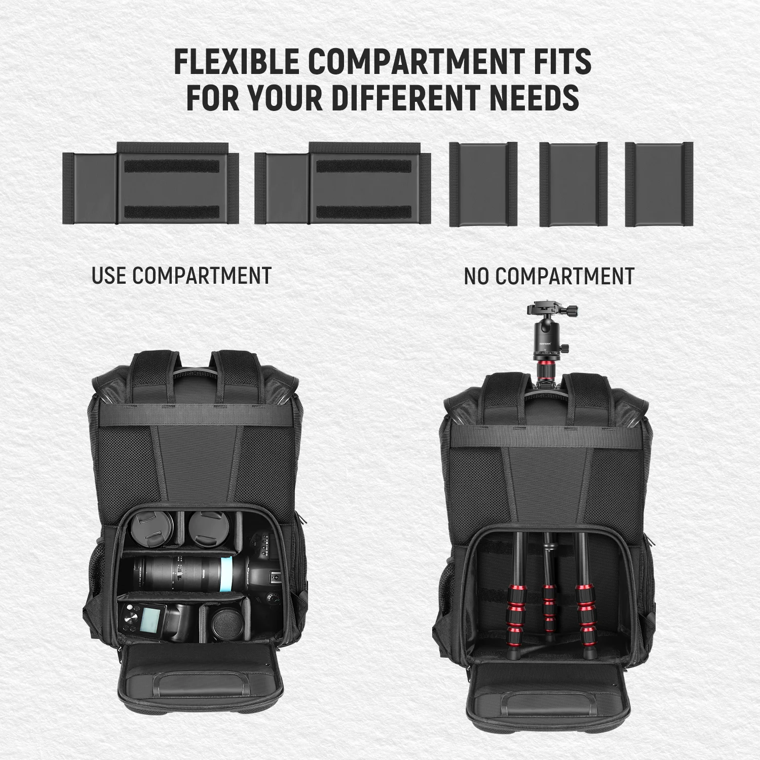 Съемные и регулируемые Внутренние Разделители можно реорганизовать, чтобы соответствовать вашим фотографическим шестеренкам, а также все Внутренние Разделители можно снять и использовать в качестве повседневного рюкзака. Они изготовлены из ударопрочного хлопка EPE для предотвращения столкновения оборудования.