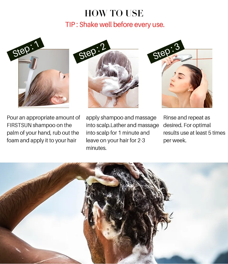 Шаг 1: Налейте соответствующее количество шампуня FIRSTSUN на ладонь, вытрите пену и нанесите ее на волосы;