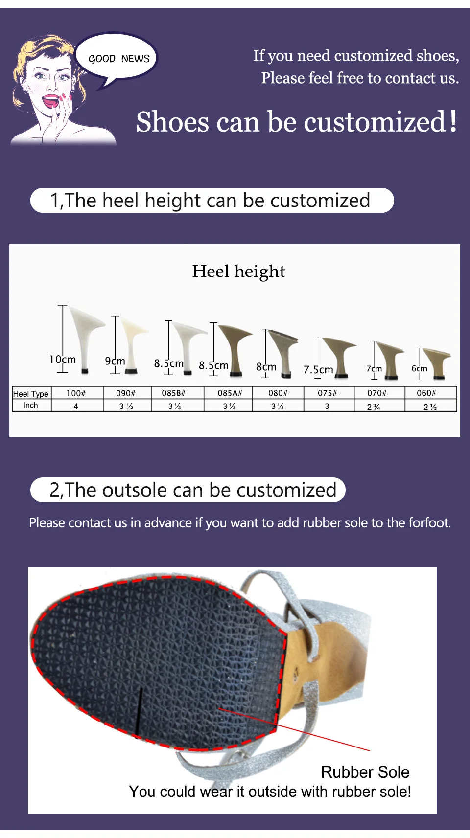 Мы поддерживаем различные типы каблуков и высоты, которые можно настроить бесплатно. При необходимости, пожалуйста, ознакомьтесь с нашим дисплеем пятки и затем сообщите вам о ваших потребностей при размещении заказа.