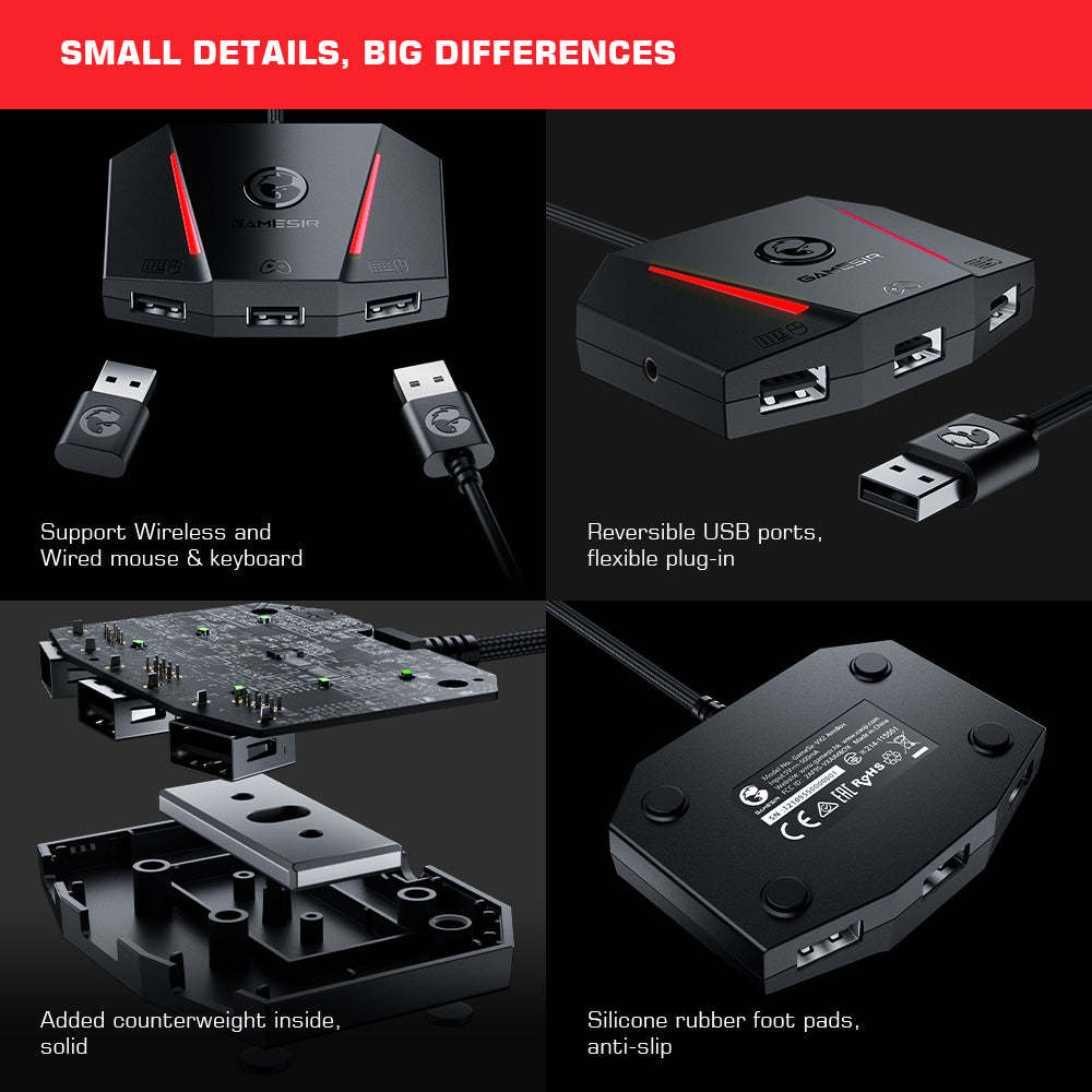Вы когда-нибудь пробовали подключать usb-кабель, но вы не уверены, каким образом он идет? Кажется, вы всегда выбираете неправильный путь. GameSir VX AimBox теперь может остановить разочарование, потому что он оснащен тремя реверсивными портами USB 2,0. Он позволяет подключать usb-кабель в любом направлении.