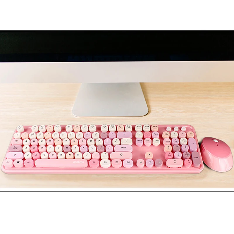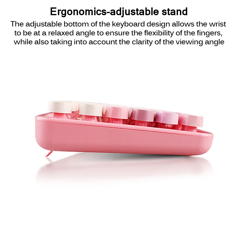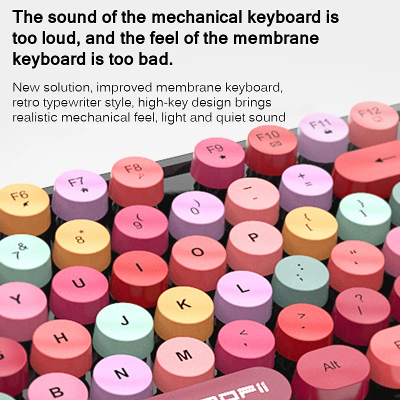 Беспроводная клавиатура разработана с 104 разноцветными клавишами круглой формы в винтажном стиле, которые могут принести вам мультимедийные комбинированные клавиши и небольшую цифровую клавиатуру, обеспечивая профессиональное обслуживание.