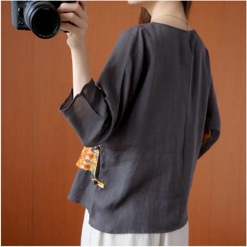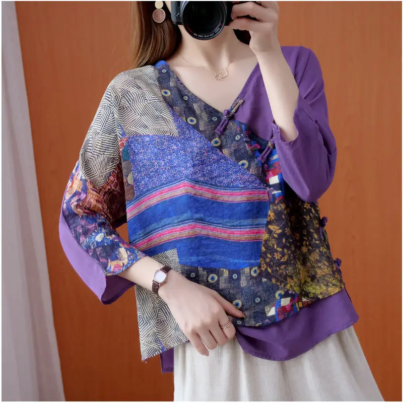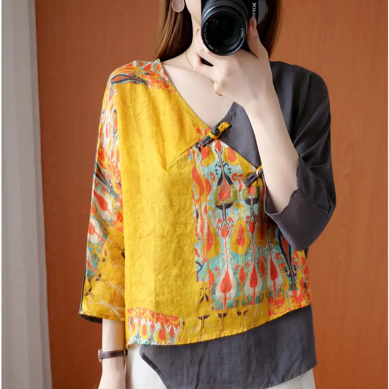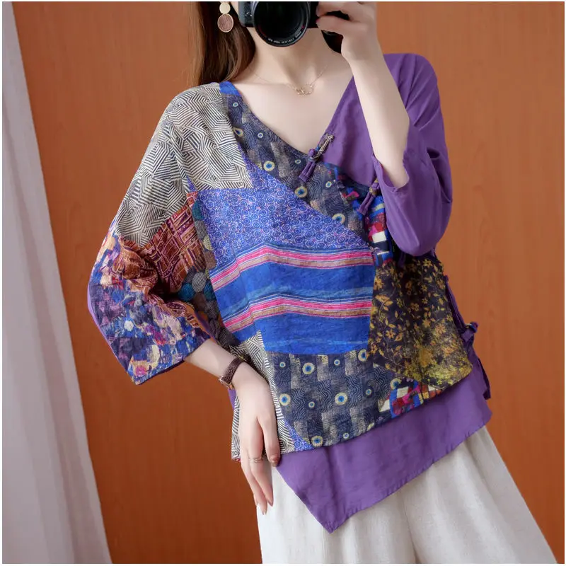 Винтажная Этническая блузка, рубашка, летняя одежда для женщин, размера плюс, женские топы, туника, 3/4 рукав, Повседневная Свободная Повседневная Блузка с V-образным вырезом