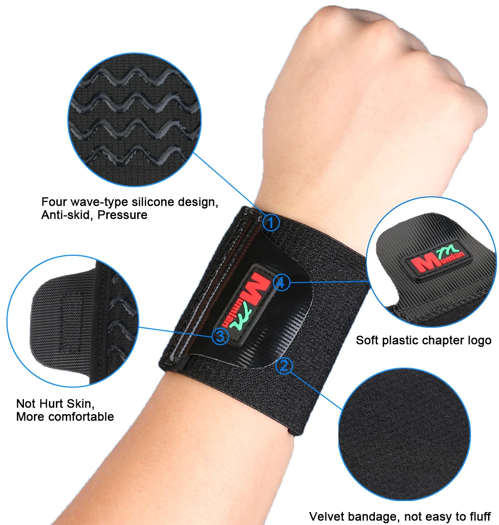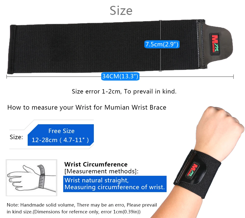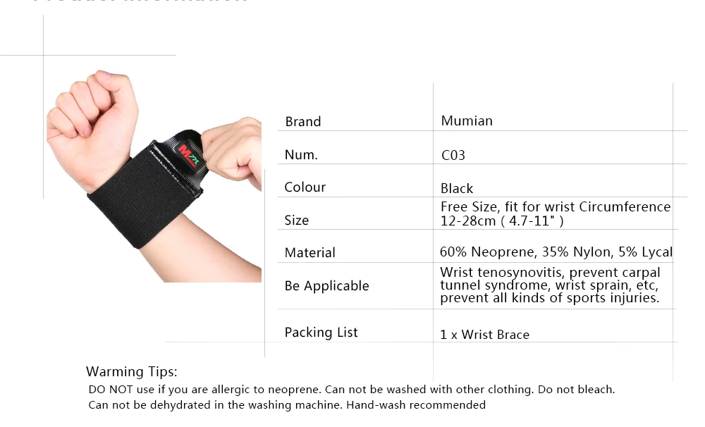 Brand: Mumian Model: C01 Colour: Black Material: 75% synthetic rubber, 25% nylon Size: all size, suitable for wrist circumference ≤ 23cm For: carpal tunnel syndrome, wrist sprain. Features: 1. Classic design 2. Adjustable tightness 3. Material ventilation 4. Wear comfortable Brand: Mumian Model: C02 Color: Black Material: 65% Neoprene 30% Polyester 5% nylon Size: Free Size, Suitable for wrist circumference ≤23cm Applicable: Carpal tunnel syndrome, wrist sprains Functions: 1.Monolithic integrated design 2.Adjustable tightness 3.Better parcel 4.Material is very breathable 5.Wear comfortable Brand: Mumian Model: C03 Color: Black Material: 65% Neoprene 30% Polyester 5% nylon Size: Free Size, Suitable for wrist circumference ≤23cm Applicable: Wrist tenosynovitis, prevent carpal tunnel syndrome, wrist sprain, prevent all kinds of sports injuries, etc Functions: 1.Silicone local pressure 2.Bandage soft and comfortable 3.Adjustable tightness 4.Material is very breathable 5.Wear comfortable Brand: Mumian Model: C04 Color: Beige Material: 20% stretch yarn, 40% rubber, 40% nylon filament Size: Free Size, Suitable for wrist circumference less than 23cm Applicable: Carpal tunnel syndrome, wrist sprains Functions: 1.High flexibility, high permeability 2.Adjustable tightness 3.Material is very breathable 4.Wear comfortable