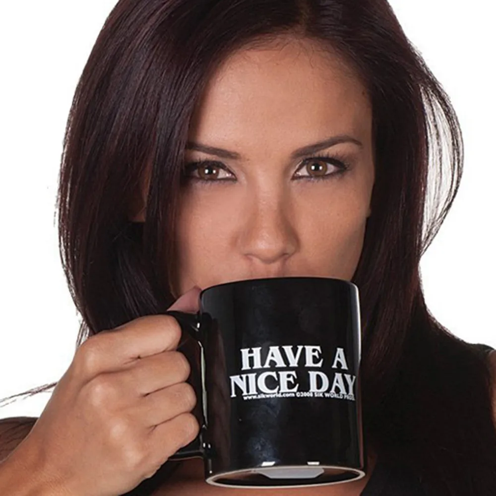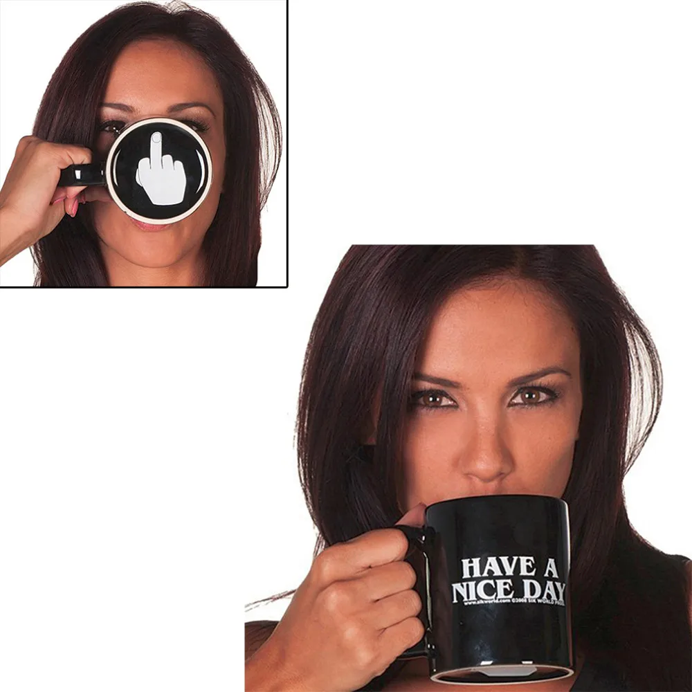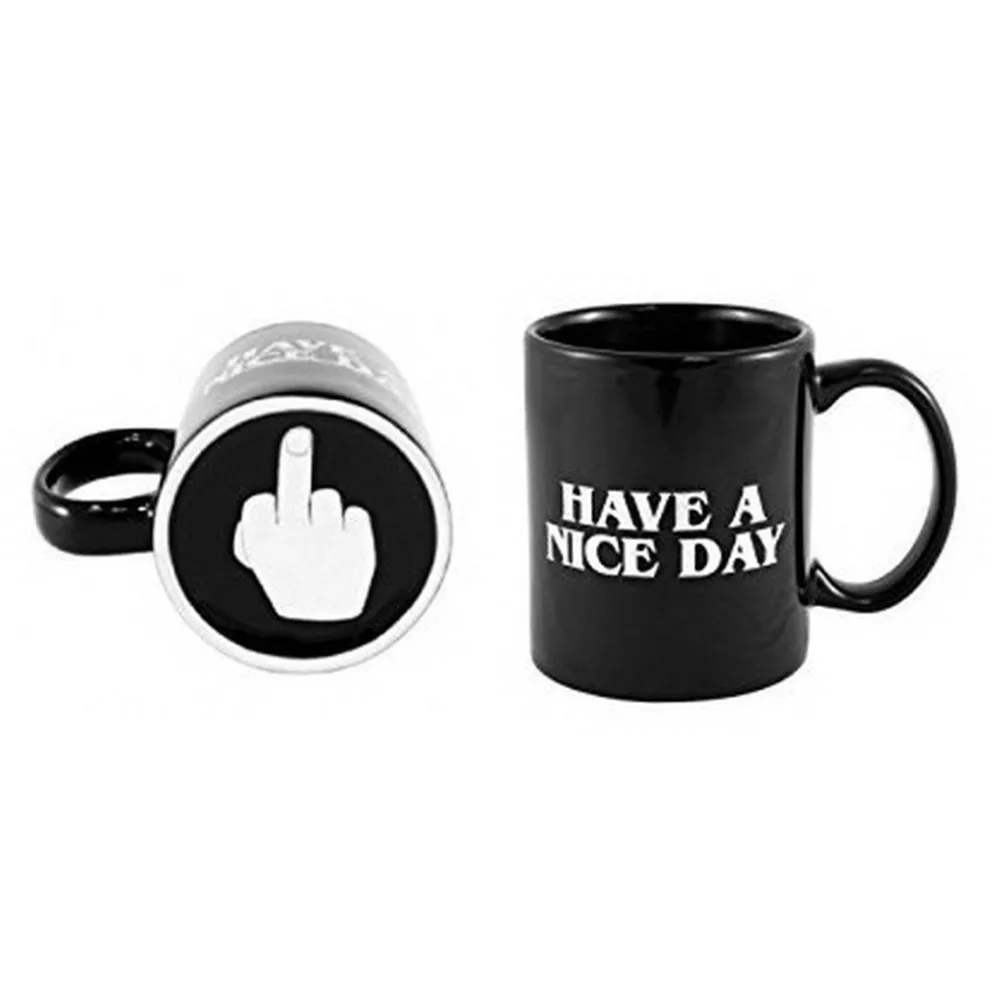 Это кофейная кружка со словами «хорошего дня» на ней и средним пальцем на дне кружки.