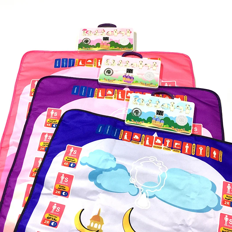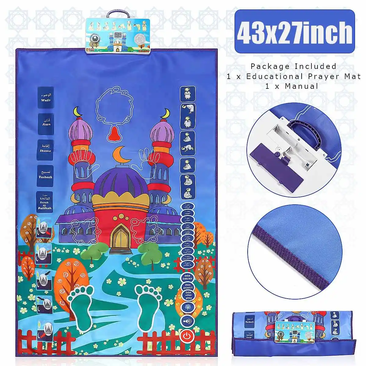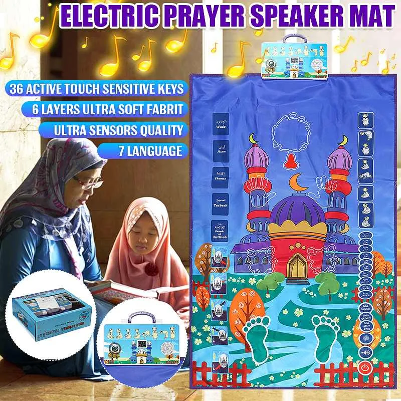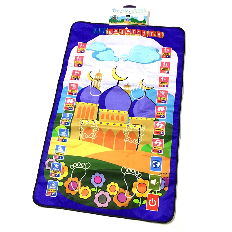 -Интерактивный молитвенный коврик чувствителен к прикосновениям и имеет Предварительно записанные ключи, которые можно трогать, чтобы показать звук, например, время молитвы, как делать wudu, читать суры, говорить duas, И многое другое.