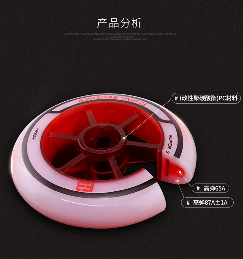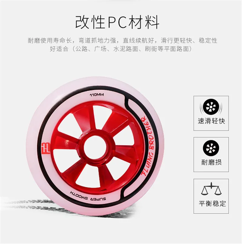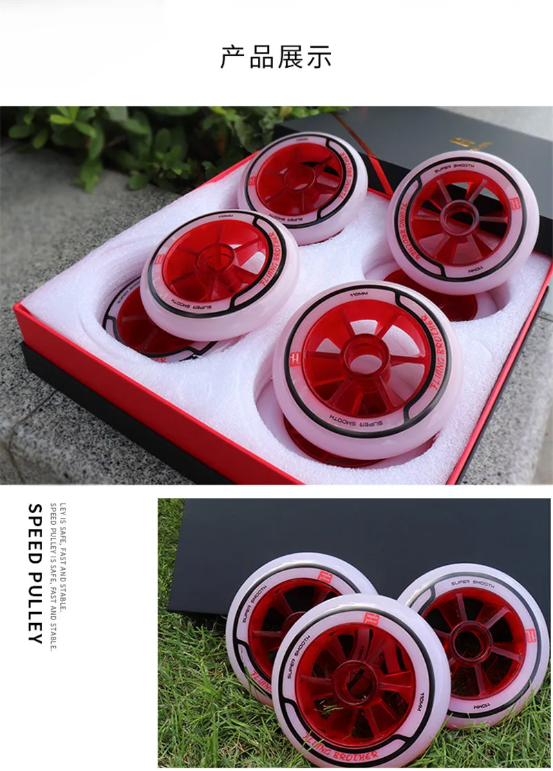 Это колесо с двухъядерным дизайном, для профессионального соревнования по скорости; Толщина 24 мм, используя подшипник 608; Внешняя твердость-XXFirm level. Вы можете выбрать размер 90 мм/100 мм/110 мм/125 мм;