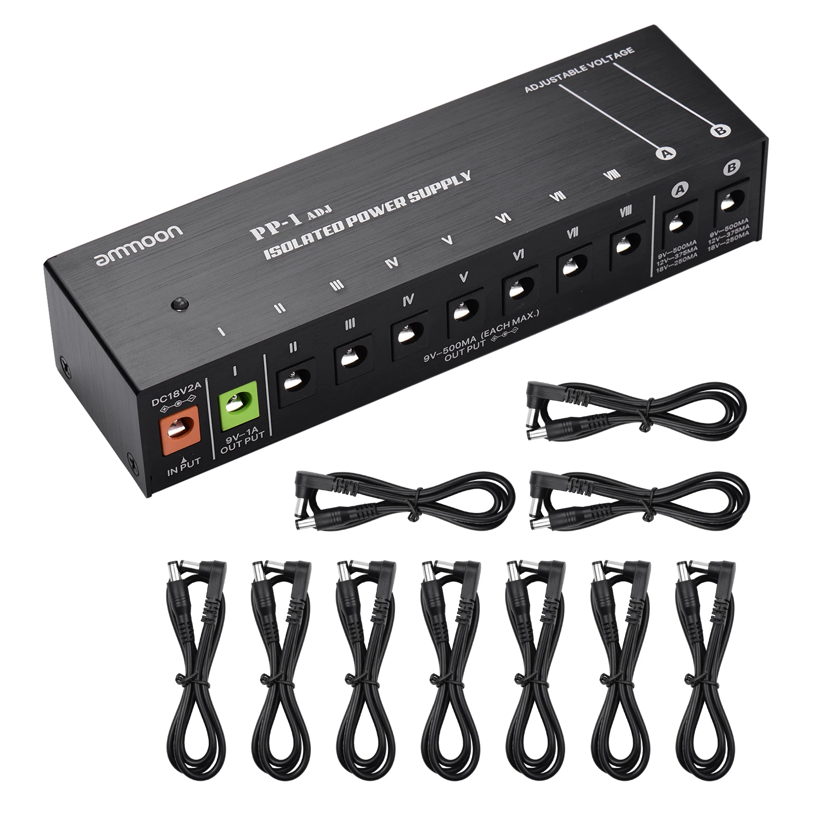 Стабильные выходы питания 9 в:Одна выходная мощность 9 В, 1 А (макс.) для маломощного цифрового гитарного усилителя; Семь выходов мощности 9 В, 500 мА (каждый макс.) для большинства педалей цифровых эффектов.