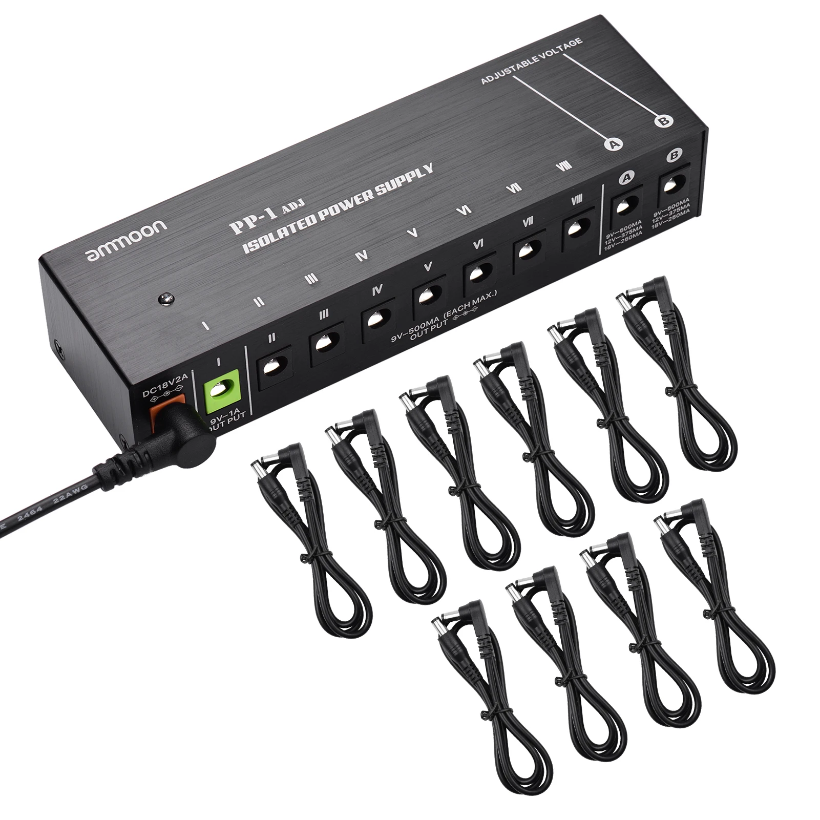 Компактный и прочный:Компактный размер и полностью металлический корпус, портативный и прочный, с 10 изолированными выходами постоянного тока для гитарных эффектов 9 В/12 В/18 в.