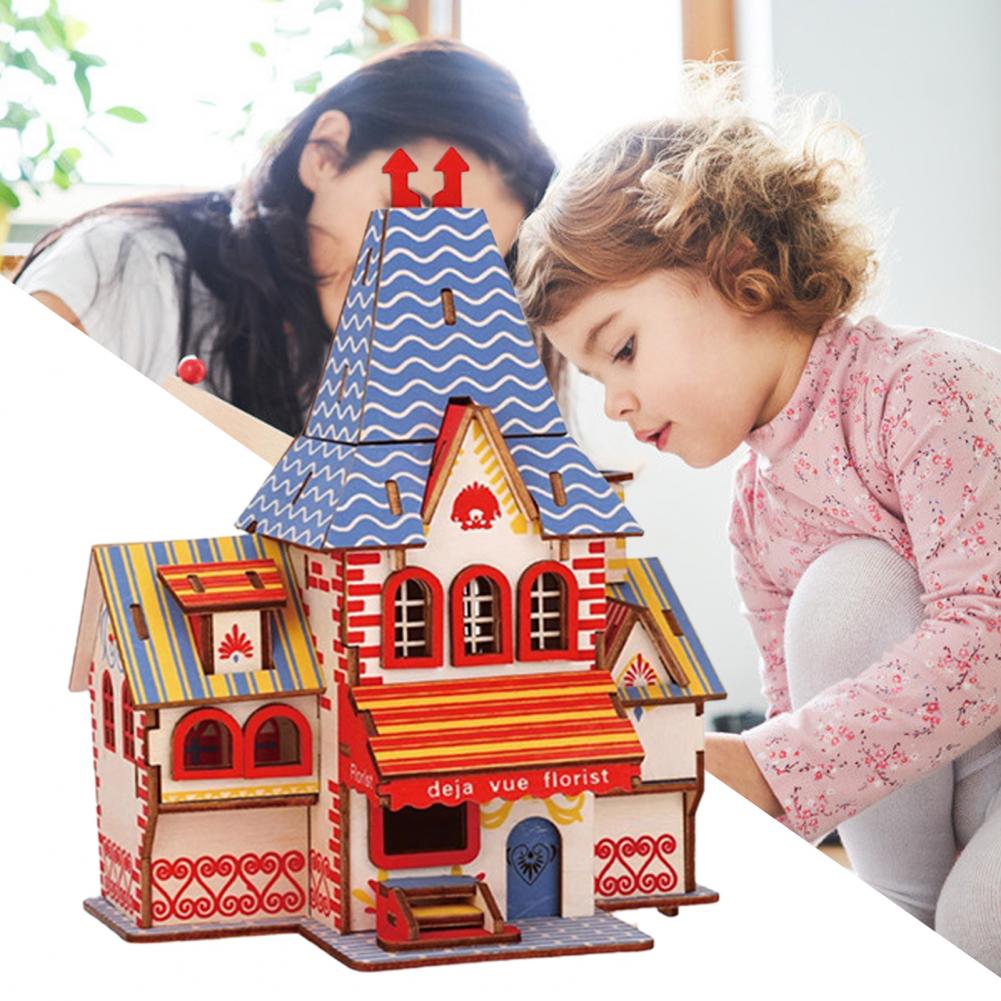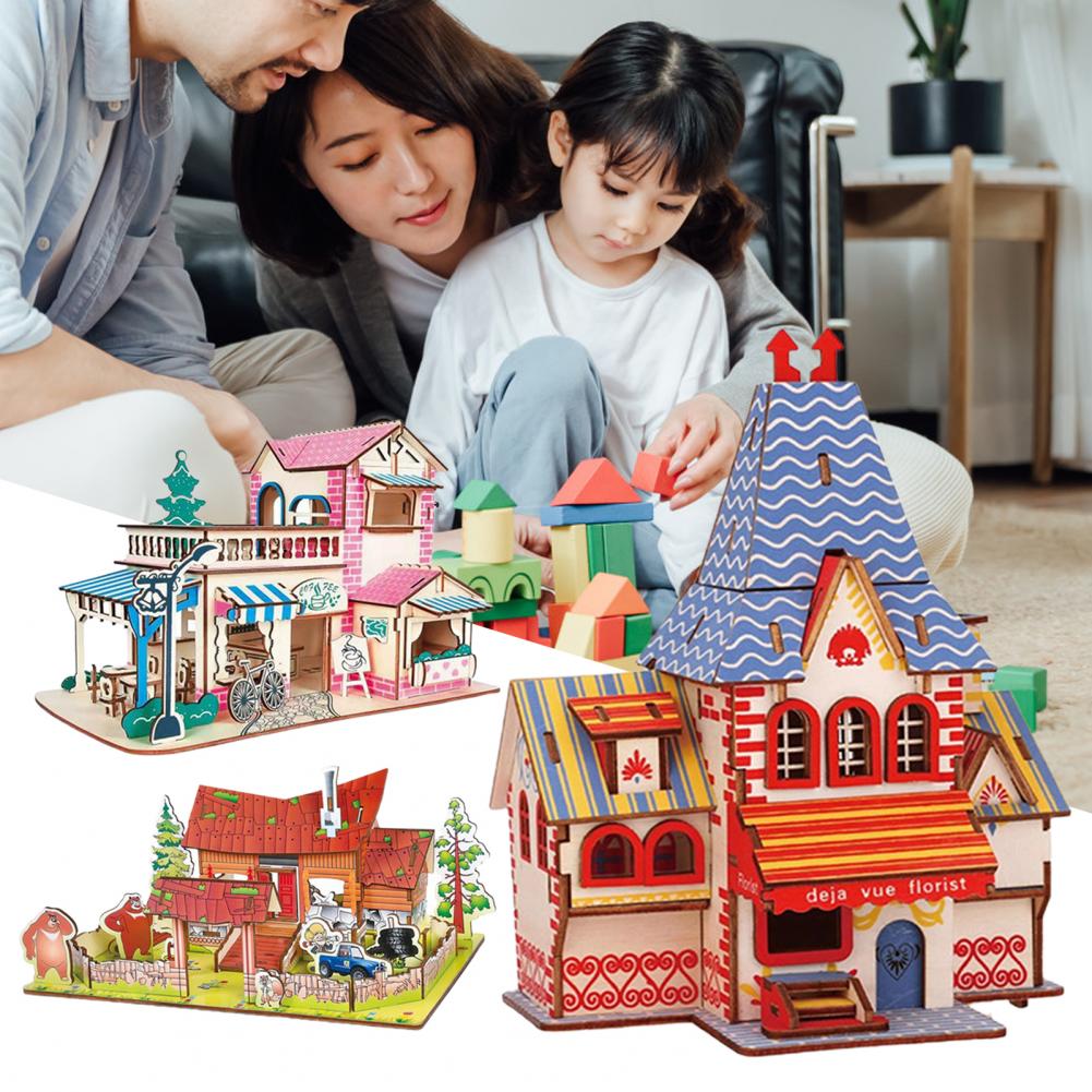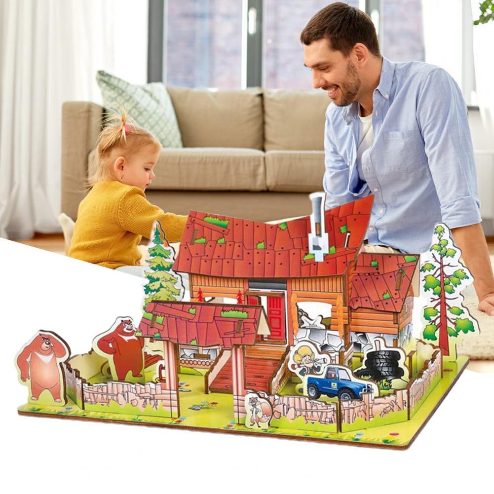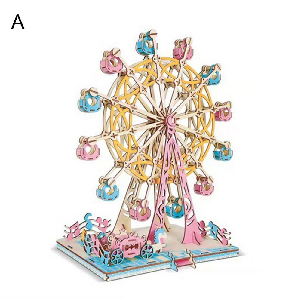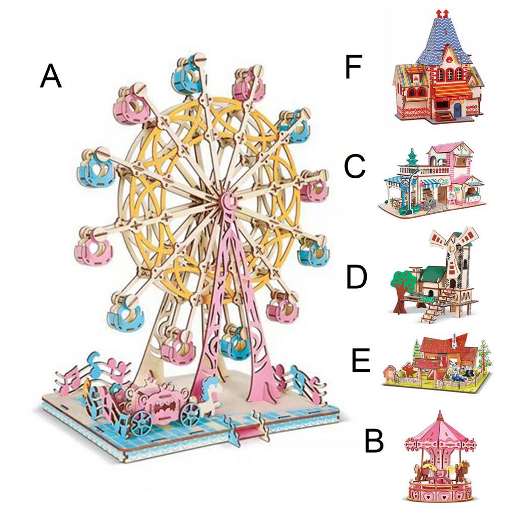 Деревянные пазлы привлекают внимание детей из-за трехмерного цветного колеса обозрения, карусели или архитектурного дизайна дома,