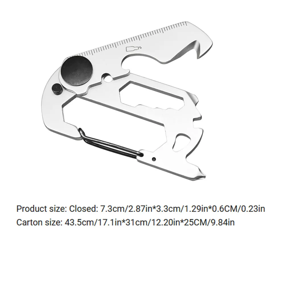Описание функции: 1. Кольцо для ключей 2. Открывалка для бутылок 3. Крестовая отвертка 4. Плоская отвертка 5. Проволочный инструмент 6. Карабин 7. Гаечный ключ 8. Шкала 9. Ремень безопасности 10. 5,5 мм/7 мм/8 мм/10 мм/12 мм внешний шестигранный ключ, дюймовый стандарт1 * Открытый брелок инструмент