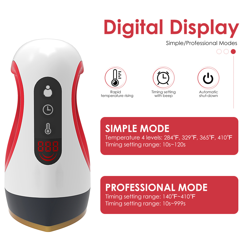 [Несколько функций]: простой режим, температура 4 уровня, 284 ℉, 329 ℉, 365 410, 410 ℉, диапазон настройки времени: 10s ~ 120s. Профессиональный режим, диапазон настройки температуры: 140 410 ~ 410 ℉, диапазон настройки времени: 10s ~ 999s.