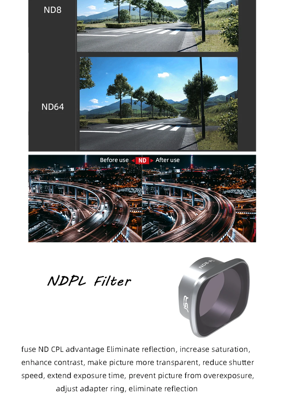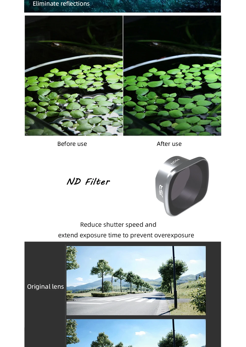 -Вы можете получить больше свободы управления диафрагмой и затвором, предоставить больше творческого пространства для способов экспозиции и эффективно предотвратить передержку. Количество за ND означает способность объектива ND блокировать светильник