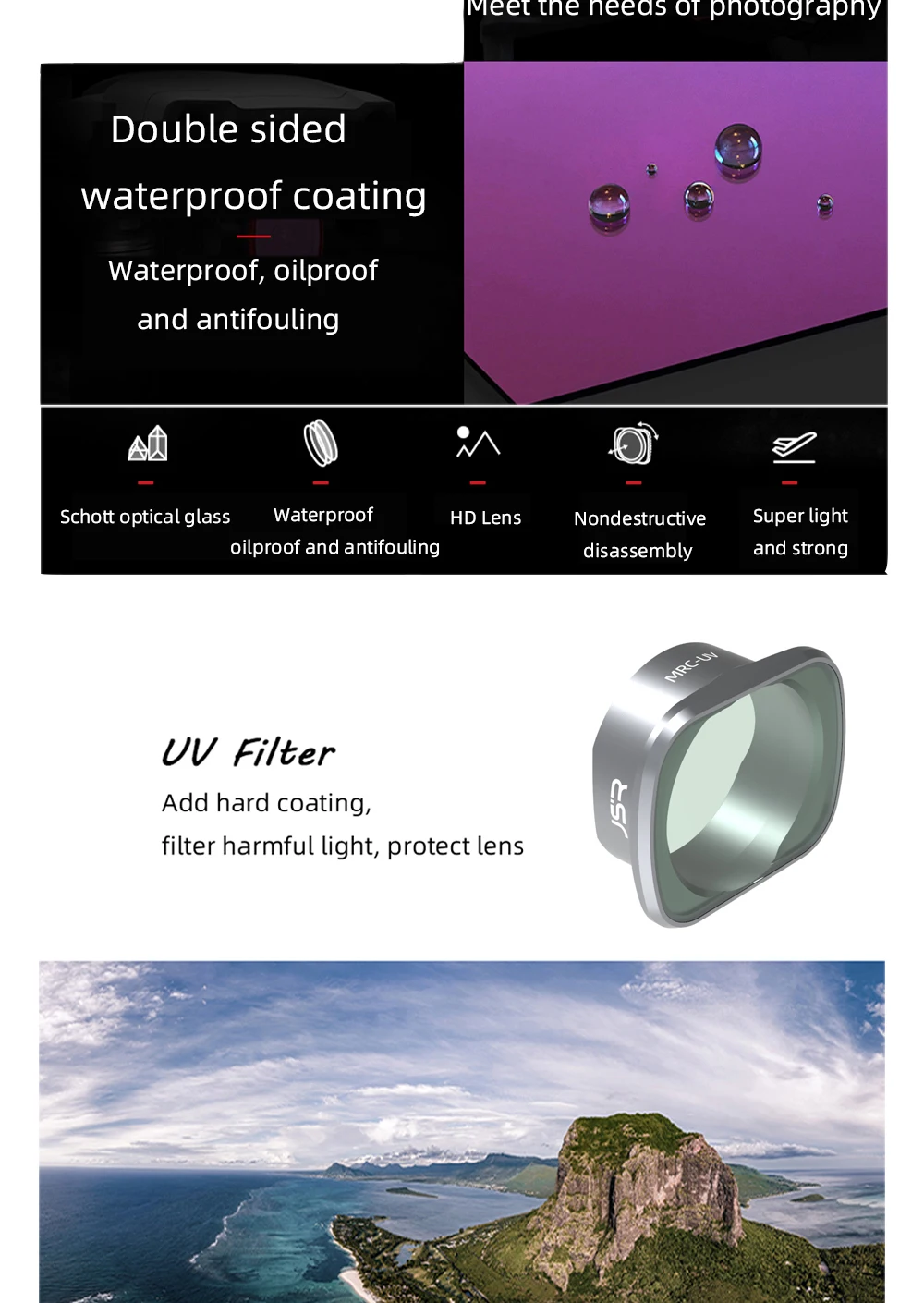 -УФ-фильтр подходит для съемки на море, горах, в снежном поле, на открытой местности и т. д. он может уменьшить синий оттенок, вызванный ультрафиолетовыми лучами. В то же время для камеры Она также может устранить помехи от ультрафиолетовых лучей на CCD, что помогает улучшить четкость и цветопередачу.