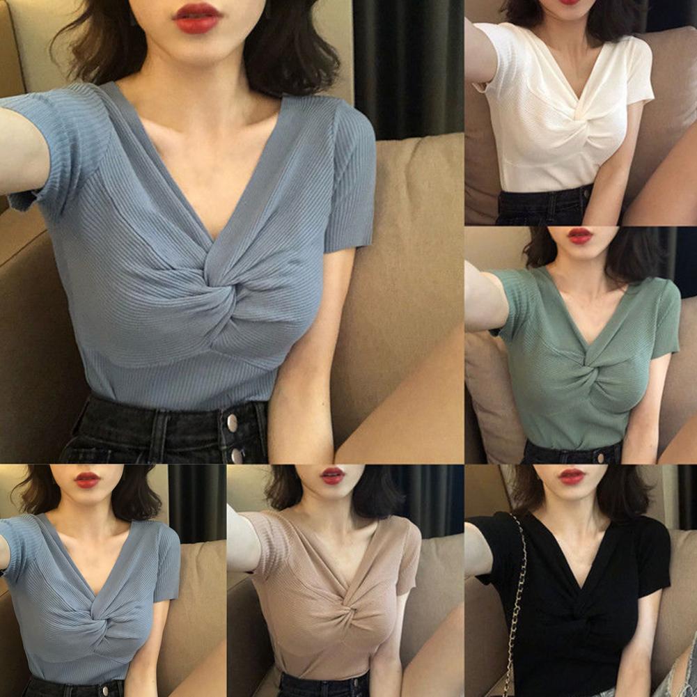 Женская стрейчевая Трикотажная футболка с коротким рукавом и v-образным вырезом