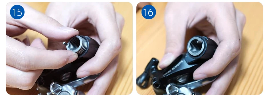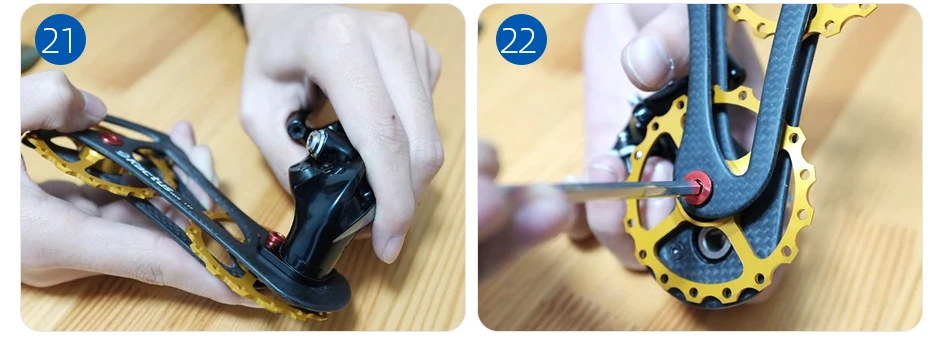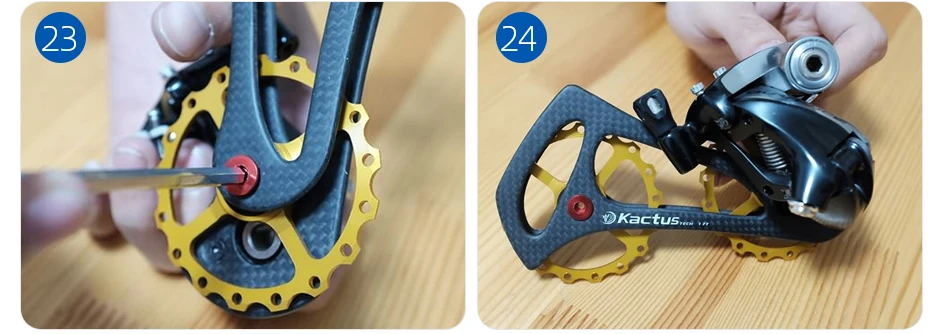 22. Вращая колесную клетку шкива на задний переключатель, отскок ограничительного блока, нажмите верхний шкив колеса болт, блокируя ограничительный блок.