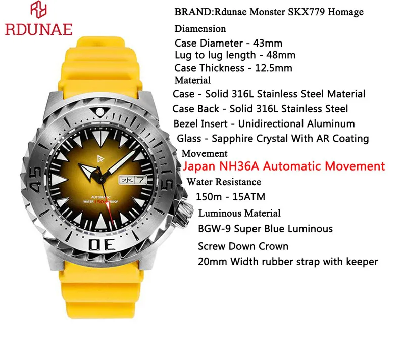 RDUNAE часы Япония NH36 часы для дайверов механические модные часы Мужские автоматические наручные часы Мужские часы