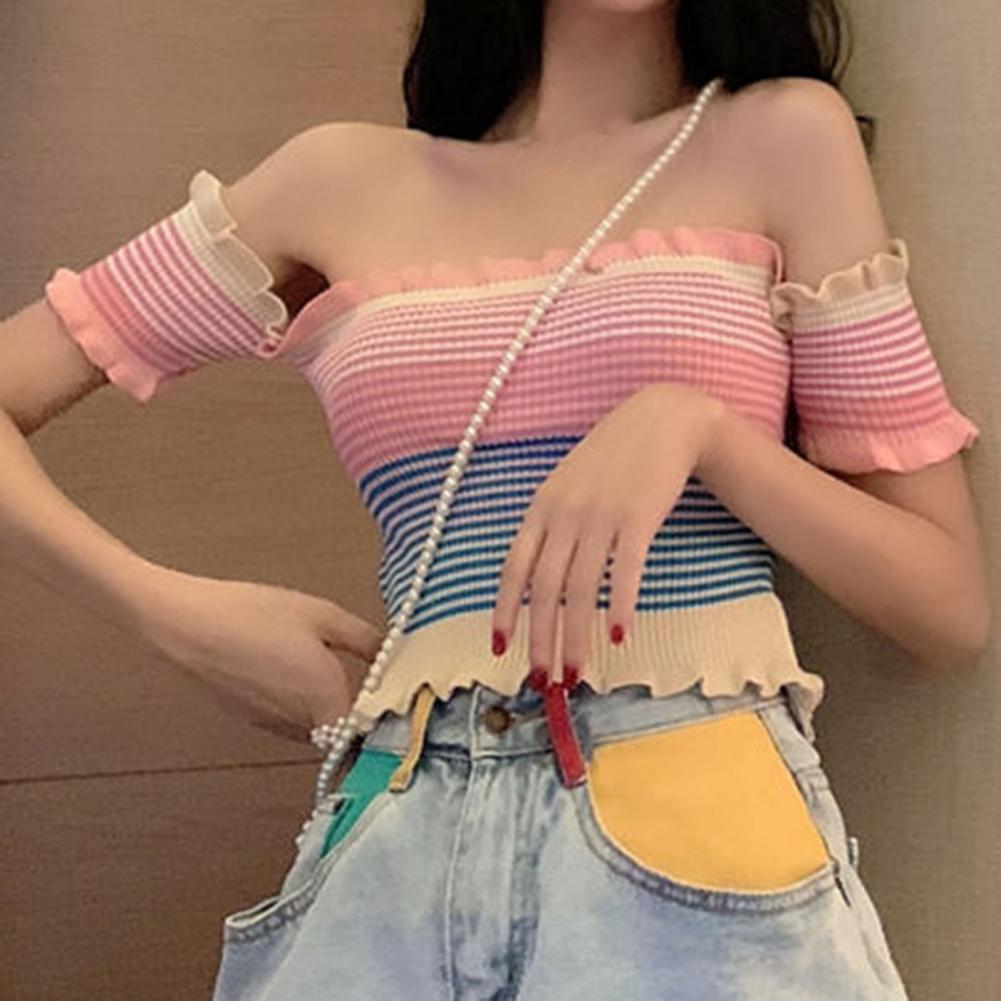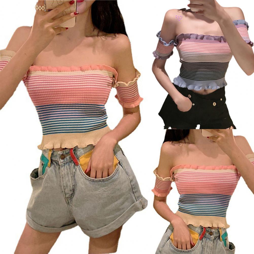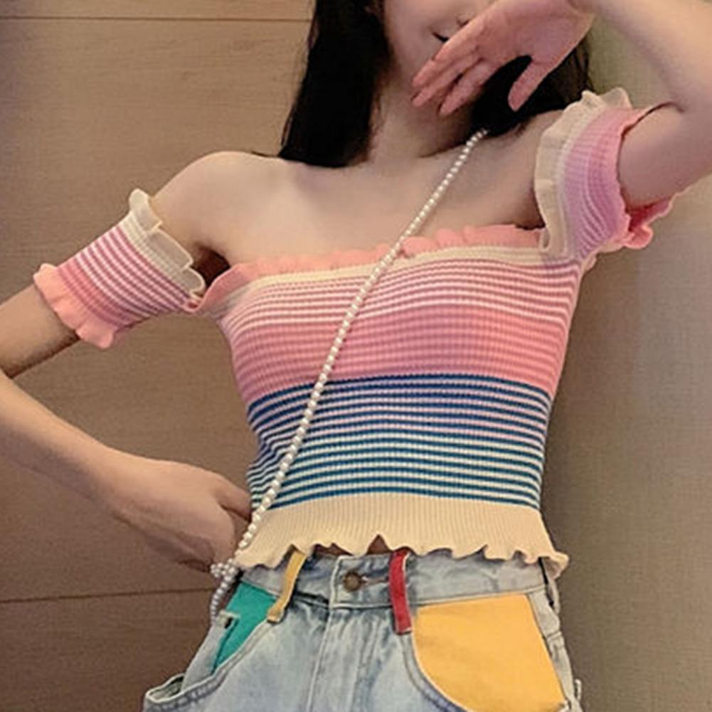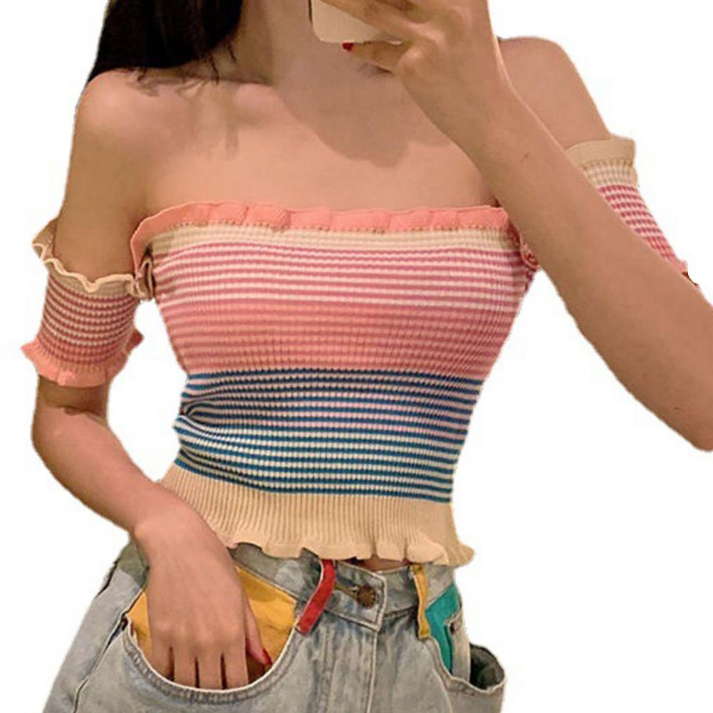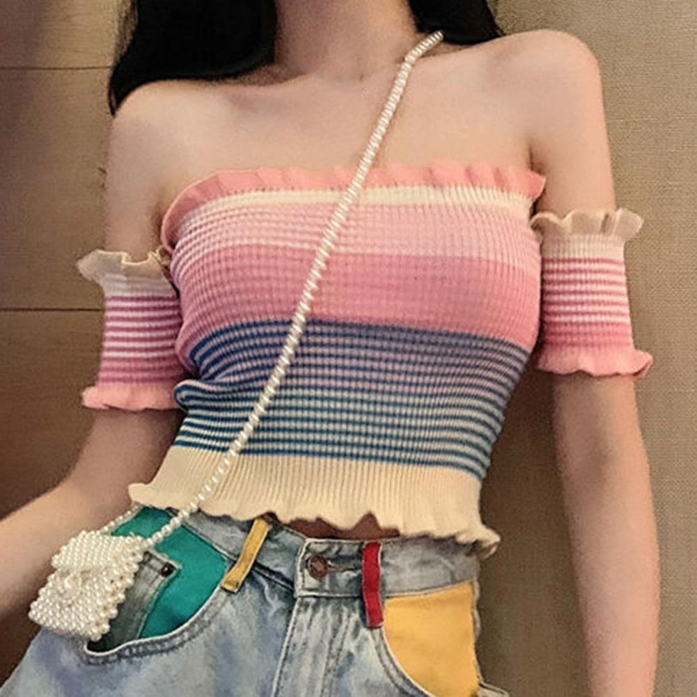 Женский сексуальный укороченный топ с открытыми плечами и коротким рукавом в радужную полоску, уличная одежда
