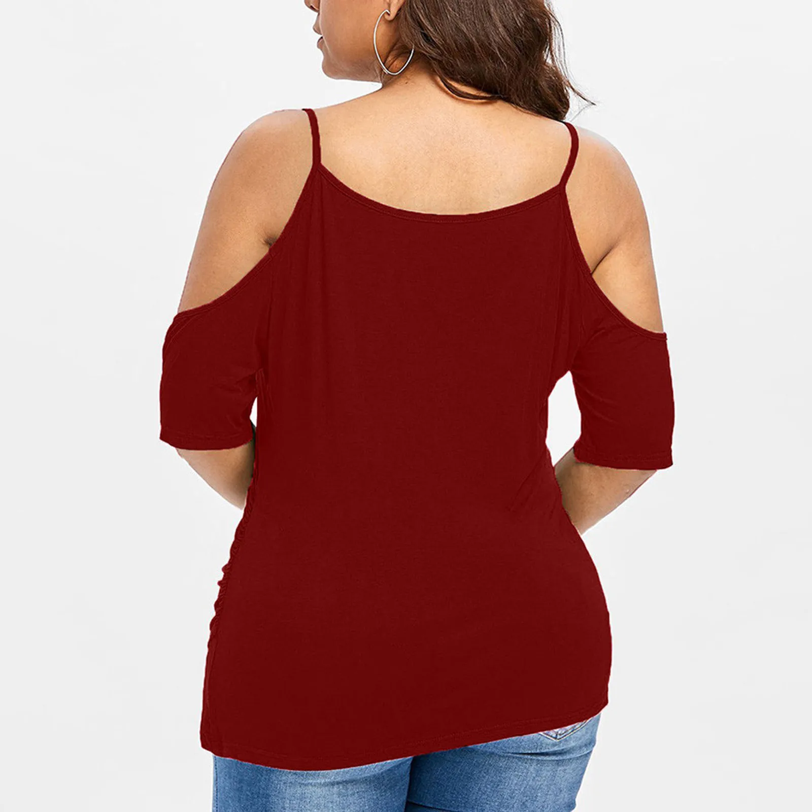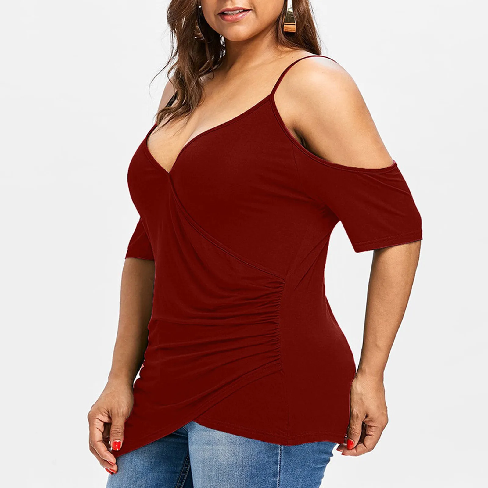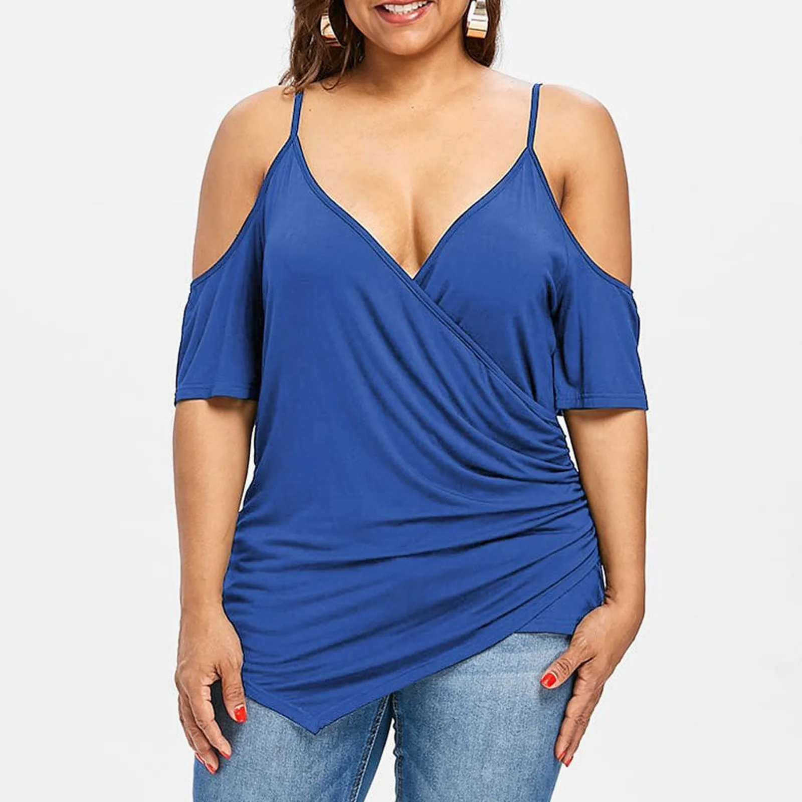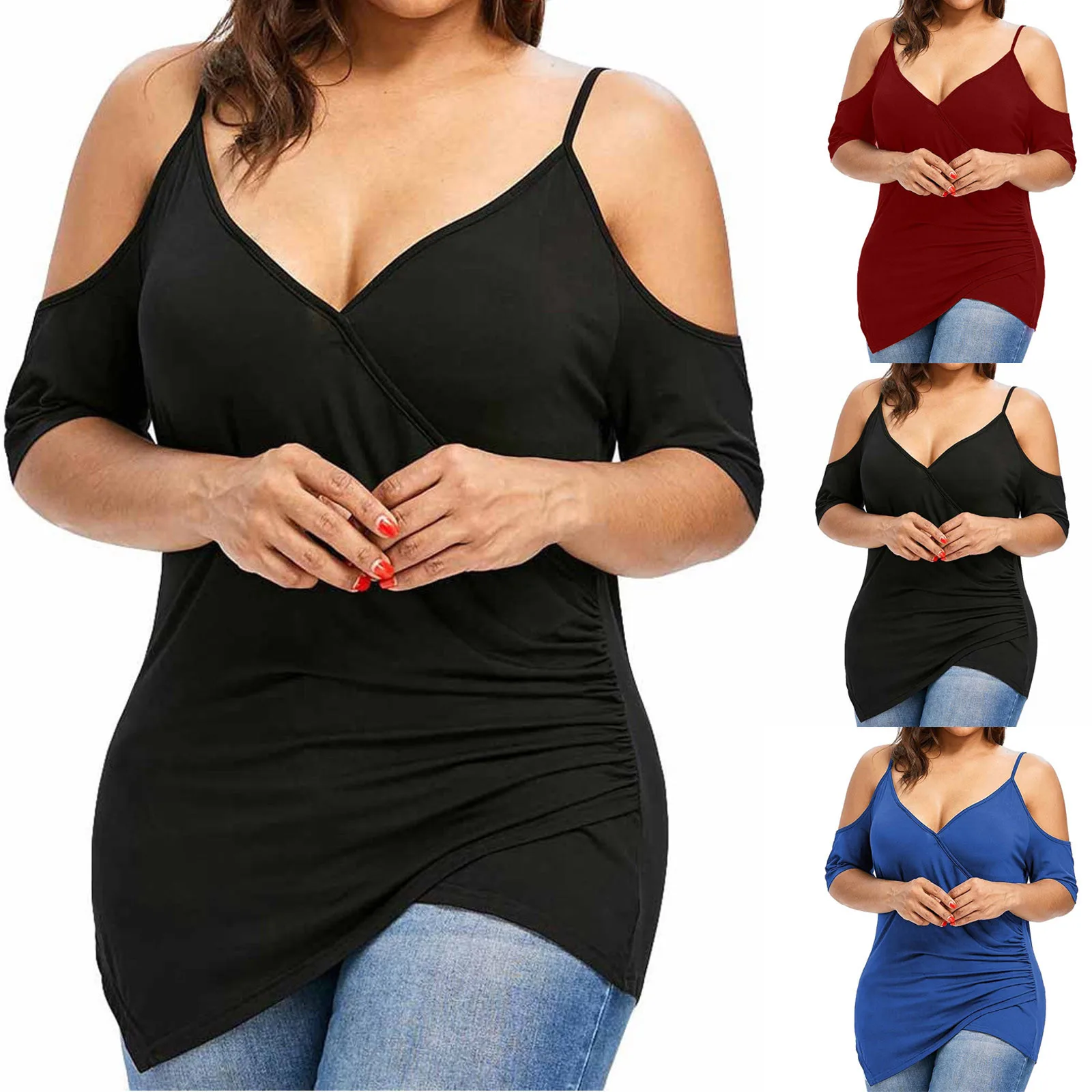 1,1. Особенности: вырез, Асимметричная футболка с открытыми плечами, v-образный вырез, топы размера плюс, Однотонная футболка-пуловер, повседневные топы, повседневная одежда, стильный и модный дизайн, Летняя Повседневная блузка.