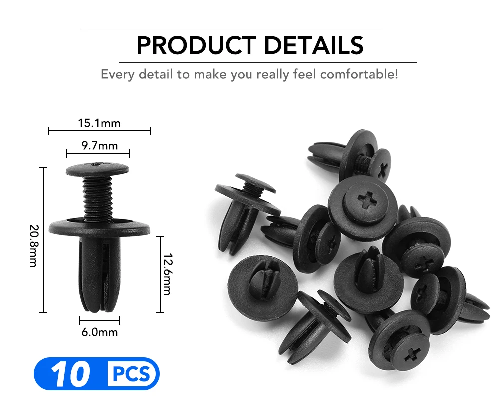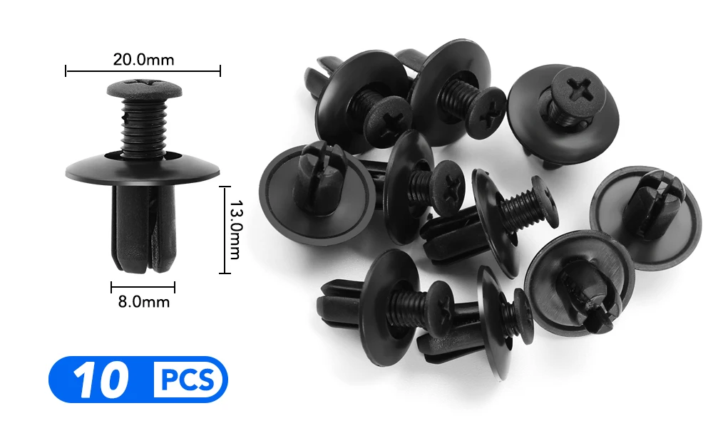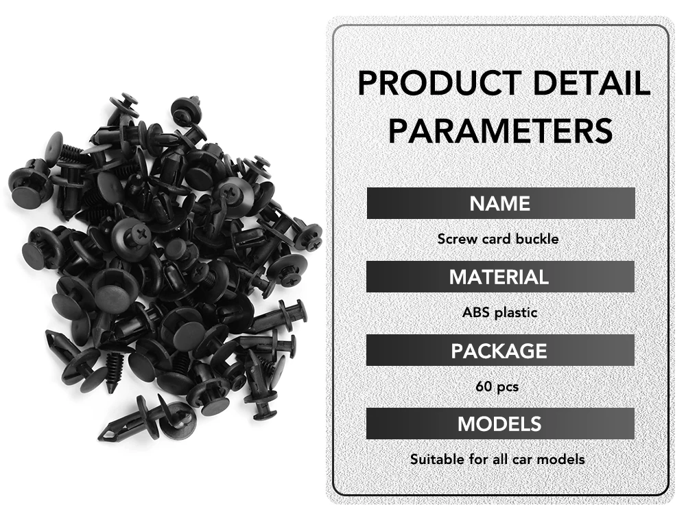 1. Изготовлен из высококачественного пластика, прочный и практичный в использовании 2. Защита от износа и коррозии, широко используется в обшивке дверей, крыльях, бамперах, радиаторных щитах, боковых юбках, решетках и т. д. 3. Быстро и легко извлеките дверные панели и обрежьте клипсы, не повреждая их. 4. Включает в себя 6 размеров, разных размеров для удовлетворения ваших различных потребностей, всего 60. 5. Экономьте ваше время и деньги. Не нужно идти в магазин автозапчастей, чтобы найти разные зажимы.