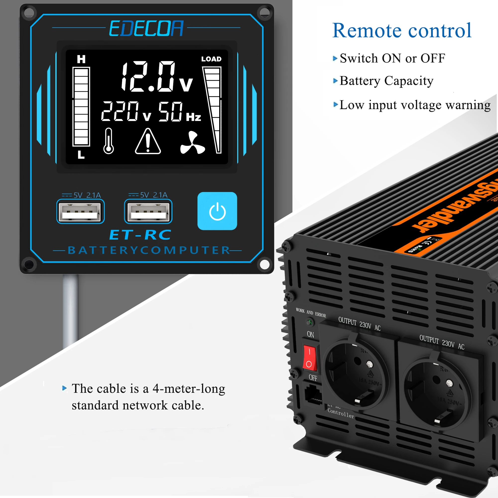 Новая версия 3,0 Многофункциональный пульт дистанционного управления, ЖК-дисплей, который показывает емкость батареи, давление нагрузки, Входное и выходное напряжение и ток, выходную частоту, температуру инвертора и код сигнализации. Два usb-порта 5 в 2,1 а для мобильных телефонов и планшетов.