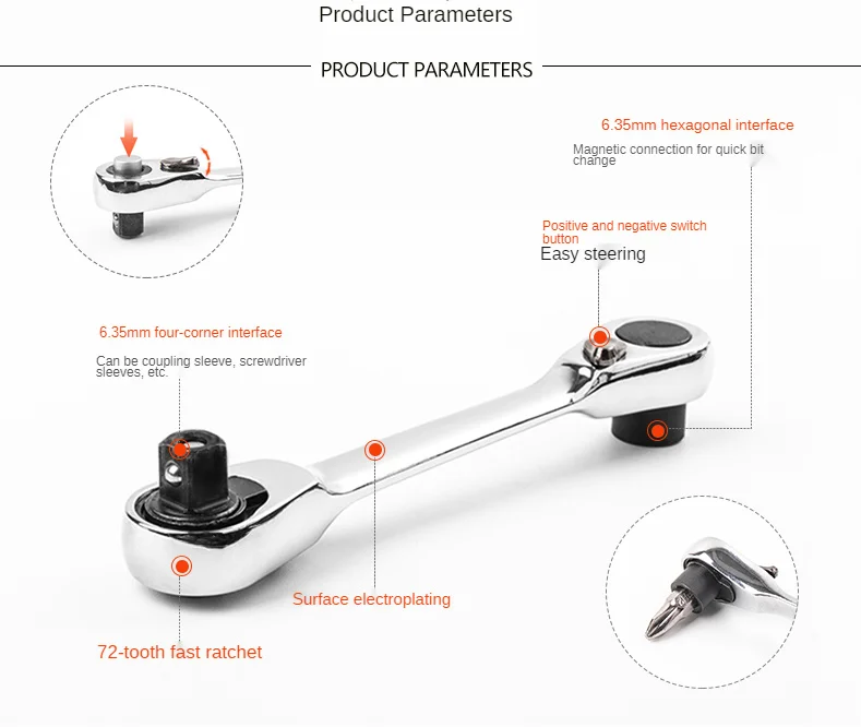 Двусторонняя рукоятка храповика с 2 размерами, которая включает в себя 1/4 дюймовый Квадратный привод и 1/4 дюймовый шестигранный бит-драйвер.