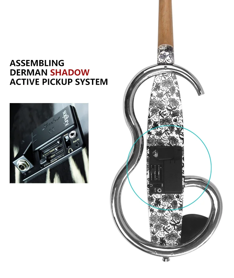 Корпус из твердой липы с никелированной зеркальной отделкой из алюминиевого сплава Кленовая горловина Гриф и фитинги из черного дерева Высокое качество установки Немецкий бренд "Shadow" система пикап В комплект входит: чехол, бант, кабель 4 м, Вес изделия 1,21 фунтов Размеры изделия 23,23x8,27x3,35 дюймов