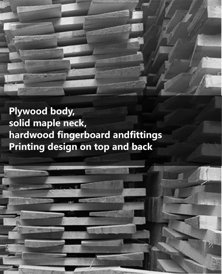 Фанерный корпус, твердая Кленовая горловина, деревянный гриф и фитинги Дизайн с принтом сверху и сзади Наряд поставляется с бантом, чехол Размер: 4/4 Вес изделия 1,21 фунтов Размеры изделия 23,23x8,27x3,35 дюймов