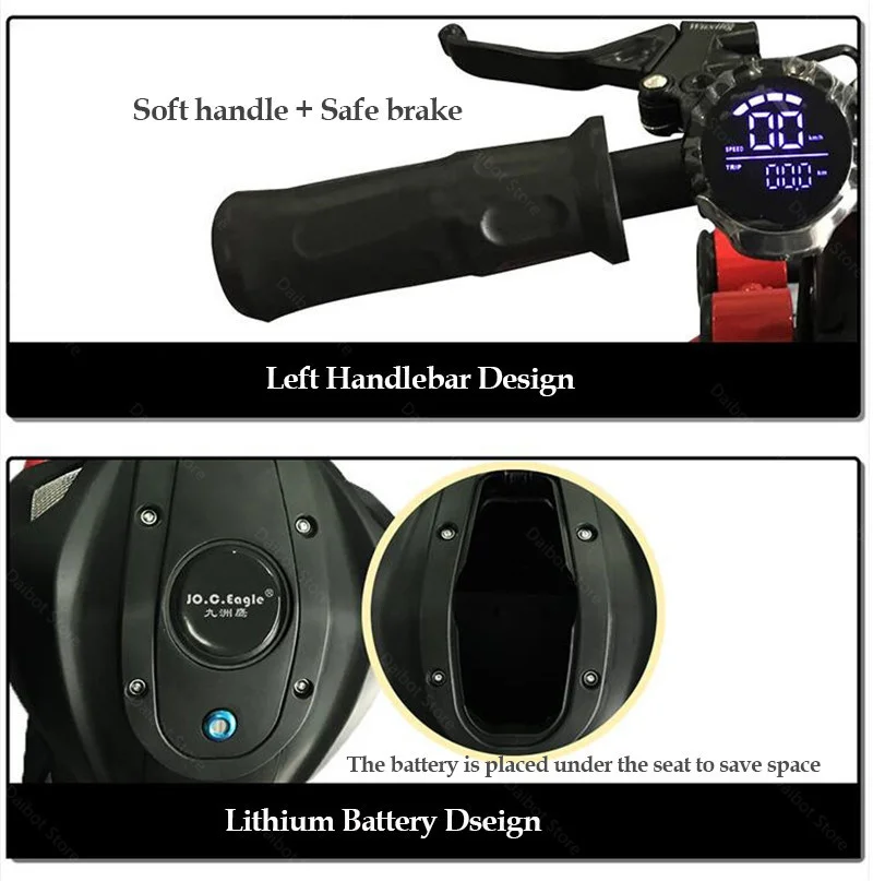 Особенность: седлоПодвесная система, Электронная тормозная система, светодиодная фара, задний фонарь, складная педаль, руль, кнопка рога.