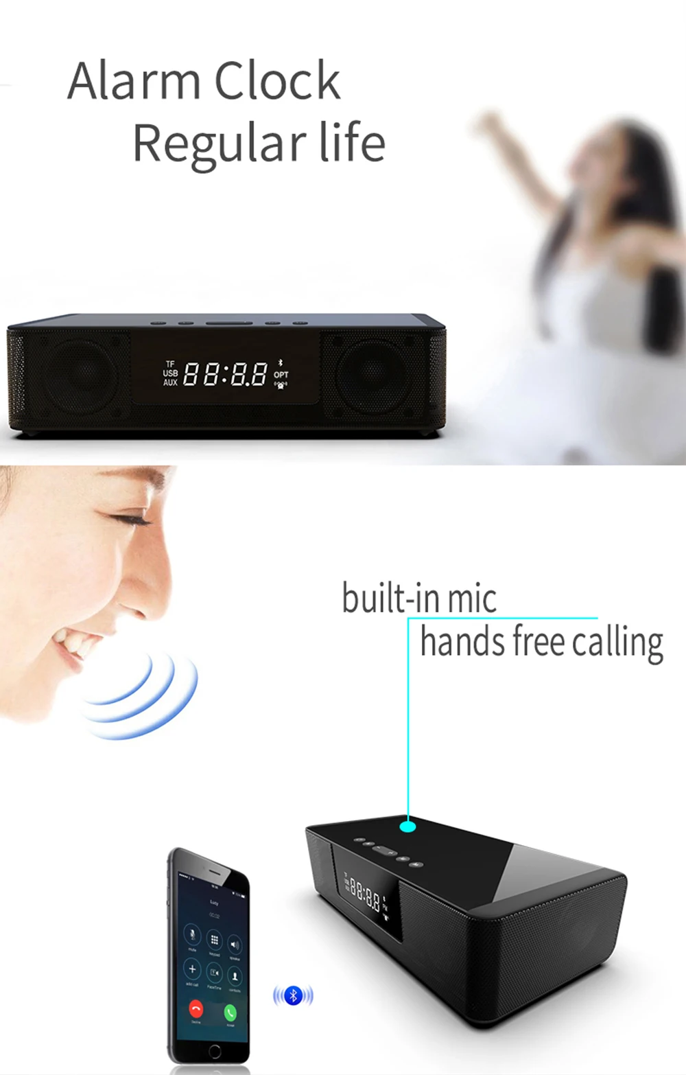 14. Тип/функция входного источника: bluetooth/FM / TF-карты/U диск/3,5 мм AV/RCA/волоконный/Инфракрасный дистанционный пульт/Встроенный микрофон/Будильник/часы/телефонные звонки в режиме hands-free/беспроводную зарядку