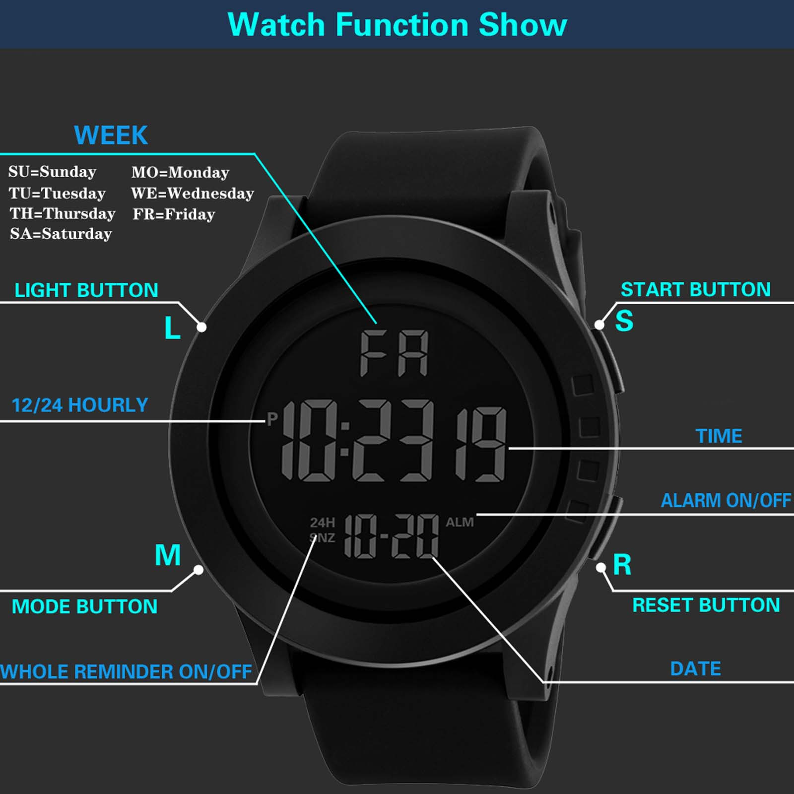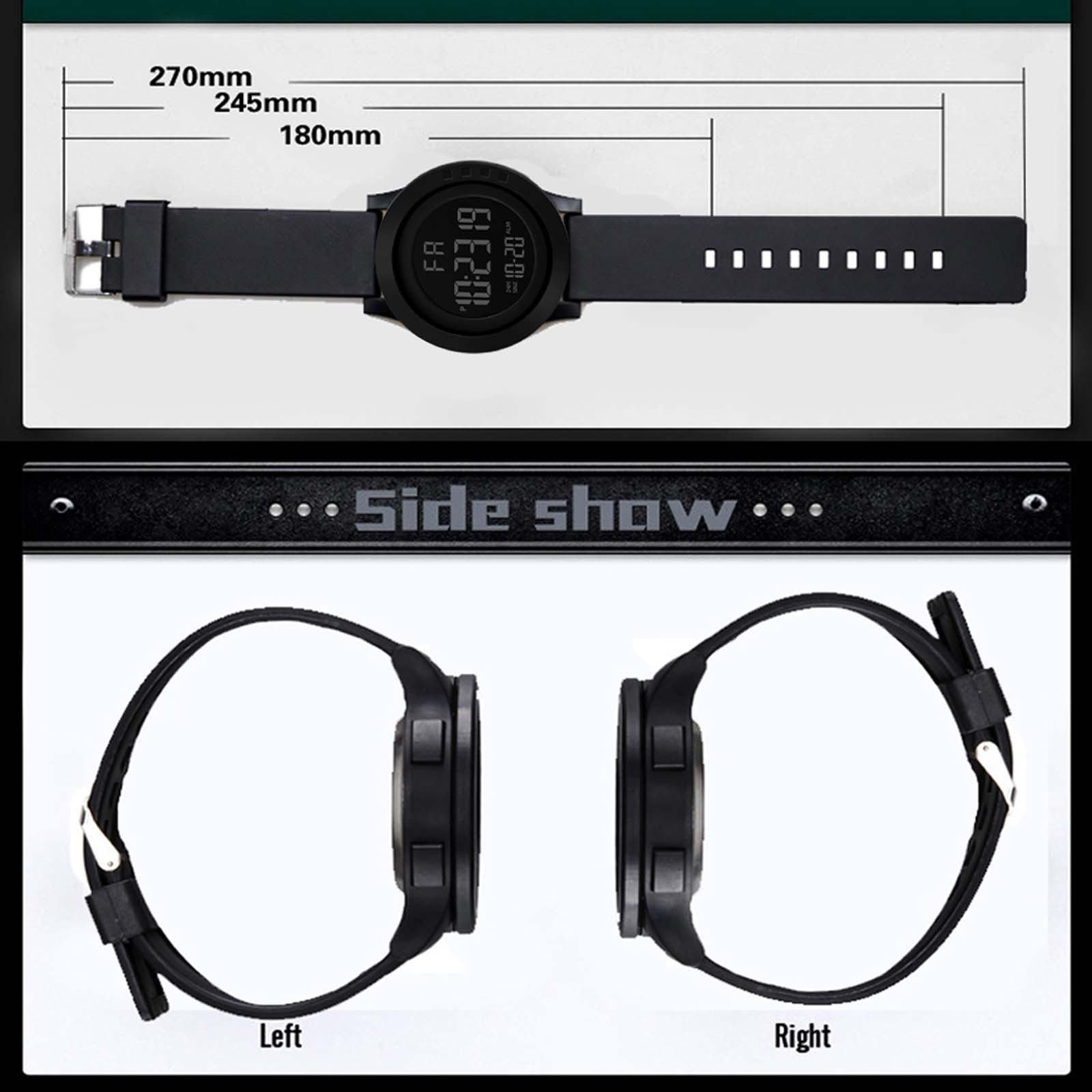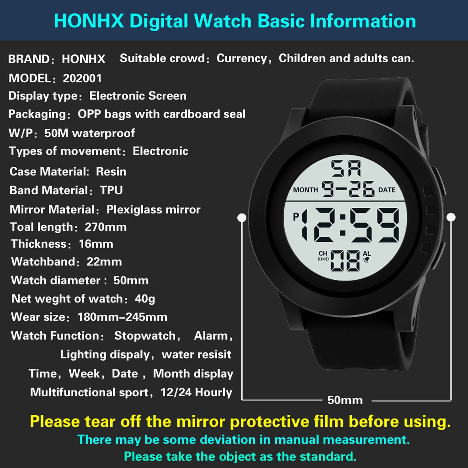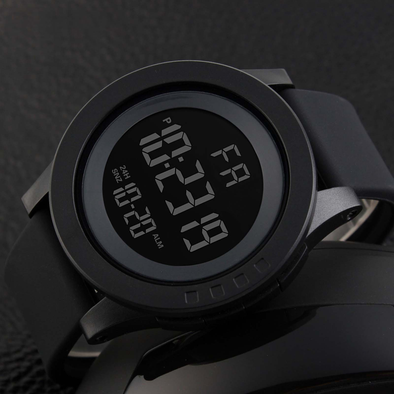 Цифровые часы: Модный спортивный дизайн циферблата. Большой циферблат и цифры с светильник, показывают время в темноте. Легко видеть время четко в светильник, легко читать. Для Мужчин's часы: обращается к Для мужчин, специально для тех, кто любит заниматься спортом, ударопрочный, полный календарь, секундомер, 12/24 часа в сутки режим отображаемого времени, а также светодиодныйХарактеристика: