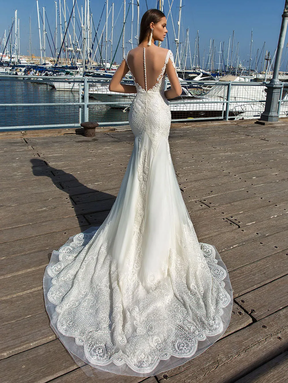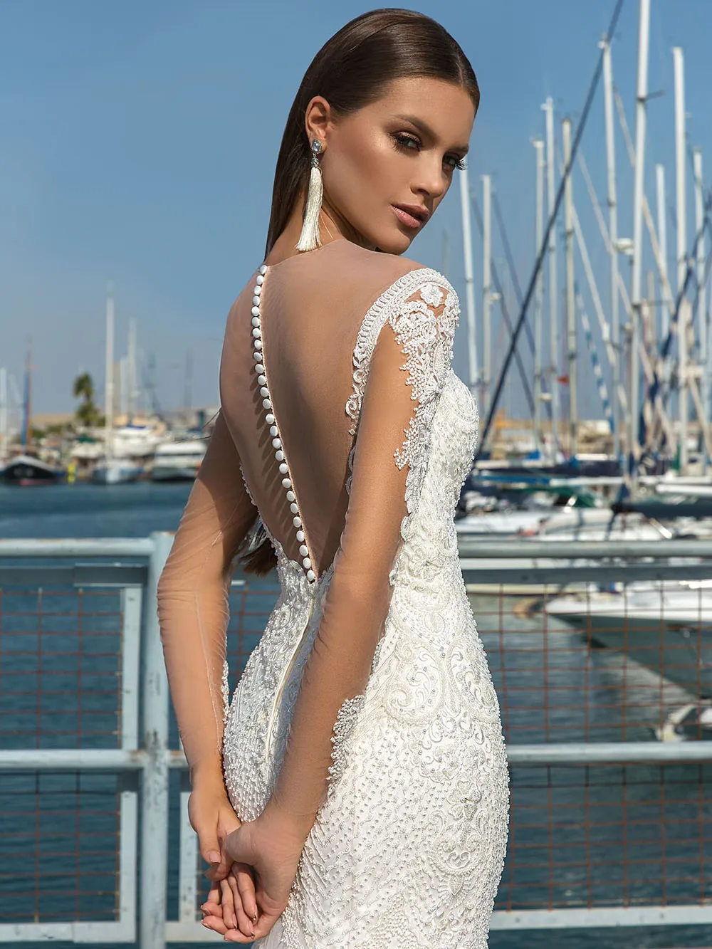 Элегантное свадебное платье русалки, Пляжное Платье с круглым вырезом и длинными рукавами, бисерная аппликация на пуговицах, белое винтажное свадебное платье с кристаллами