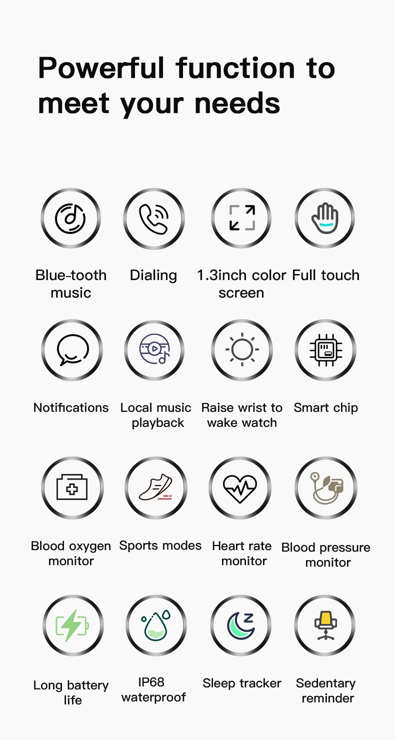 BT вызов, подключение наушников для воспроизведения музыки, локальная музыка, хранение музыки, переключатель с несколькими циферблатами, шаг за шагом, калории, расстояние, мульти спортивный режим, поверните запястье на светильник экрана, мониторинг сна, беговая дорожка, напоминание о звонках, оповещение о сообщениях, напоминание о сидячем положении, напоминание о будильнике, фотография, пульс, кровяное давление, кислород в крови.