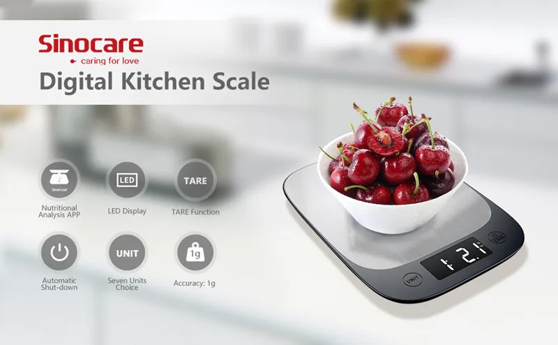 Цифровые кухонные весы Sinocare будут анализировать питательные вещества для пищевых продуктов, вычислять калории пищи и записывать ваши планы питания. После того, как еда попадает в кухонные весы, данные загружаются на ваш телефон нашим приложением Sinofood.