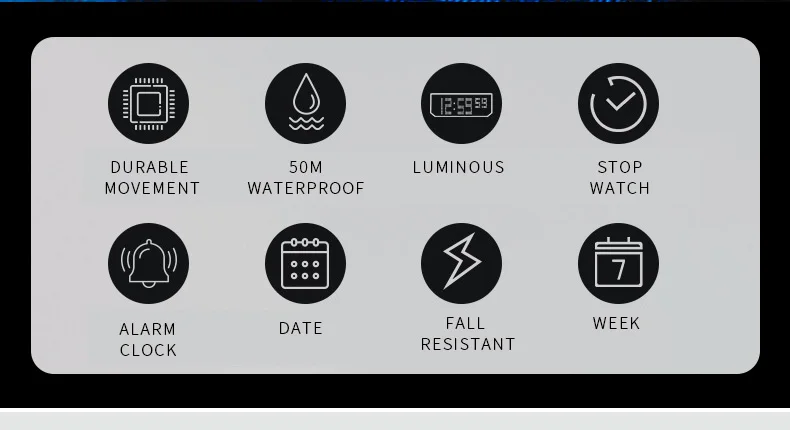 -52 мм пластиковый корпус с 3 циферблатом; Акриловые линзы; Светящийся дисплей часов; Черный отрицательный цифровой дисплей