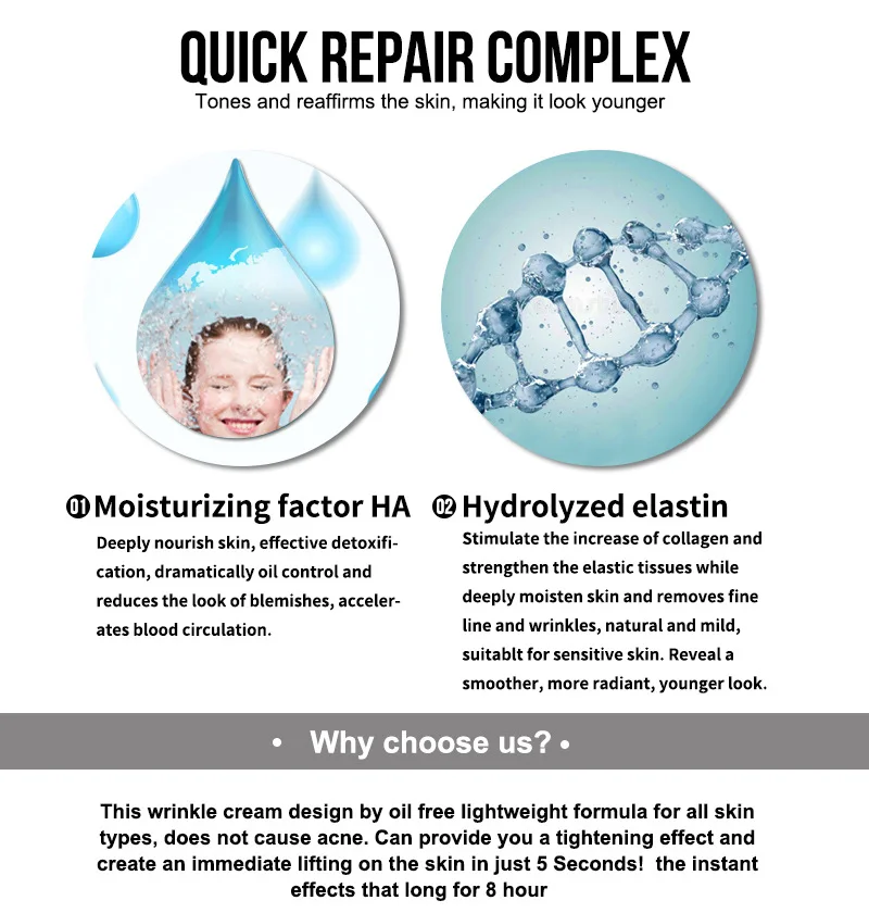 Временно уменьшает морщины и отечность глаз всего за 5 секунд, обеспечивая упругость кожи до 8 часов. Длительность варьируется от человека к человеку, отбеливание и изменение положения кожи, чтобы вы выглядели моложе. Безмасляная, Легкая формула для всех типов кожи, которая не вызывает акне.