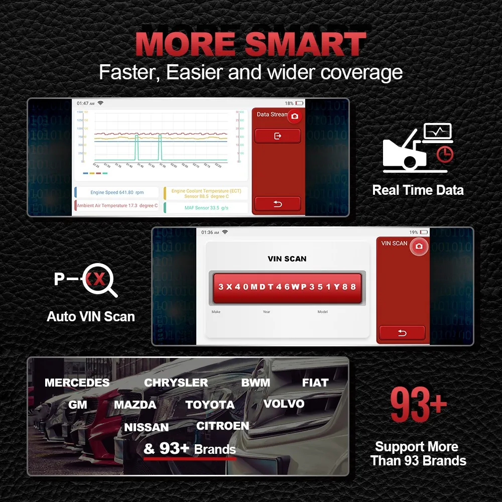 * Прочитайте DTCs из всех электронных систем управления транспортного средства, чтобы найти проблемные зоны и предложить решения;