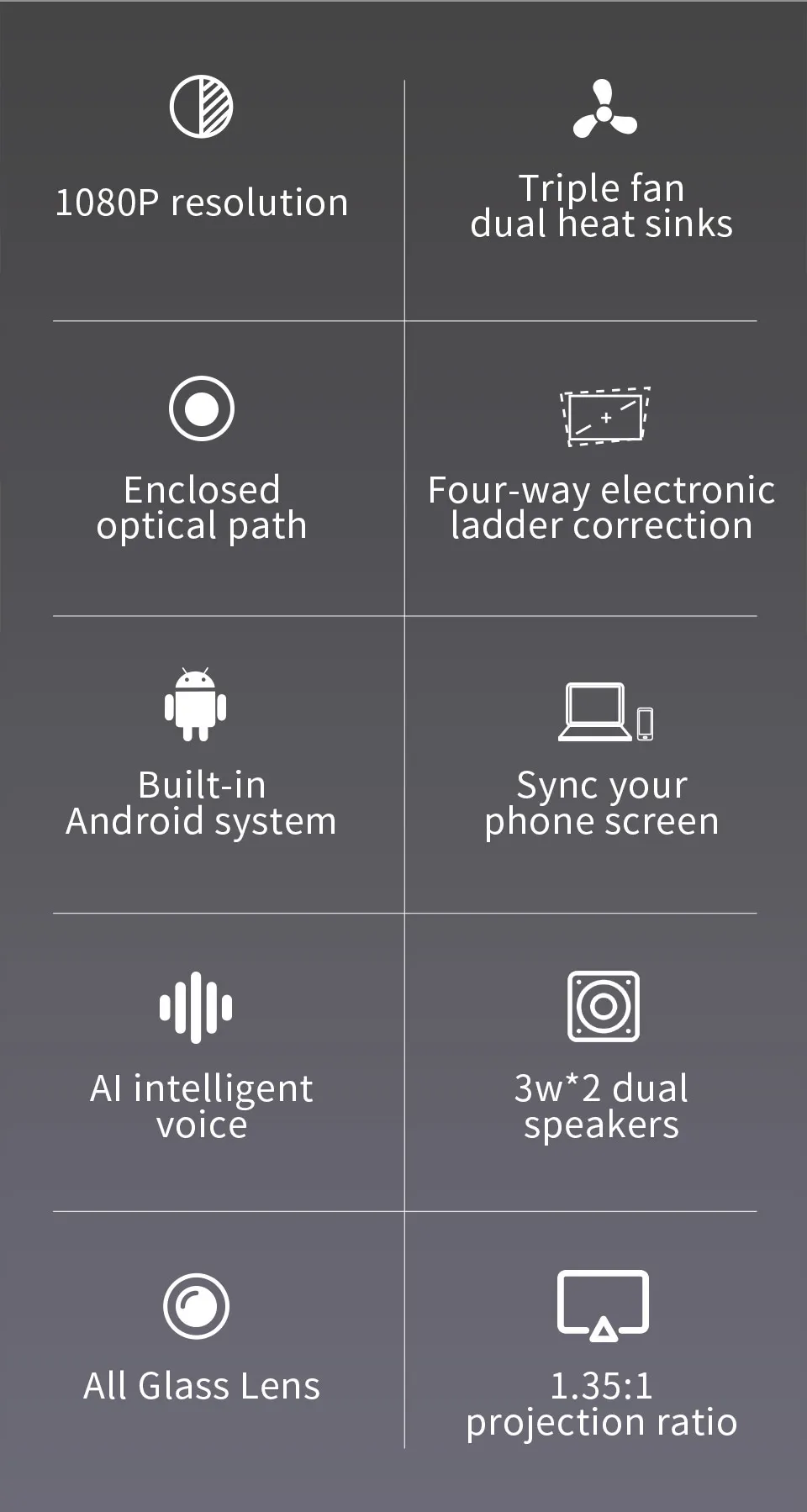 A: отношение проекции: 1,35: 1, диапазон размеров проекции: 40-120 дюймов, рекомендуемый размер проекции 50-80 дюймов.
