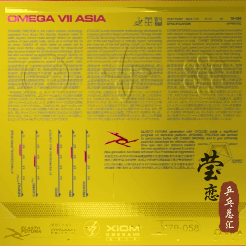 Омега 7 Азия (китайская версия) выбирает высококачественный резиновый материал, новую структуру частиц с высокой поддерживающей силой, супер эластичную поверхность и хорошо оборудованную высокоэнергетическую однородную макропористую губку для торта из углерода. Использование технологии TENSOR catapulting inner energy, технологии BIOS Green, технологии HYPER ELASTO для создания сверхэластичных конструкций, технология IMB inner energy propulsion, которая увеличит срок службы в 2 раза, И китайская клейкая поверхность CST, которая больше подходит для требований китайских друзей. По сравнению с Omega 5 TOUR мощность выросла на 15%, скорость удара выросла на 20%, а вращение удара-на 8%.