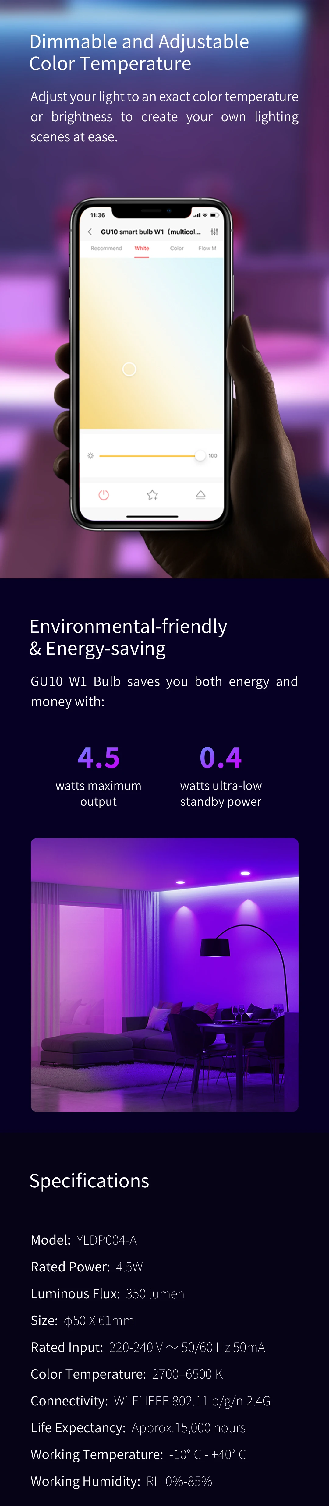 GU10 W1 лампа экономит энергию, так и денег с 4,5 Вт Максимальная выходная мощность, 0,4 Вт ультра-Низкая потребляемая мощность в режиме ожидания.