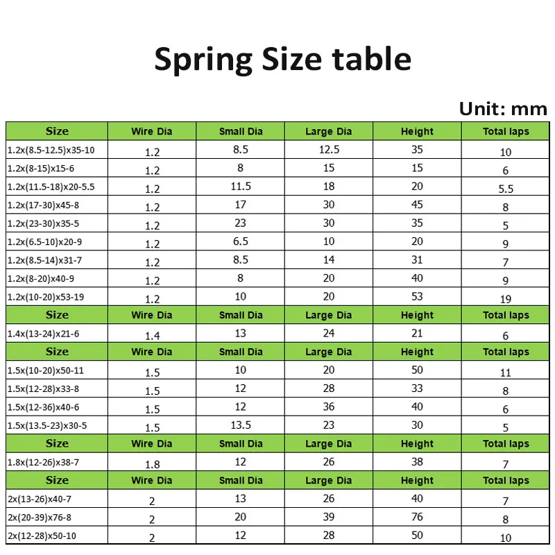 Название: конические компрессионные пружины Материал: нержавеющая сталь 304 Диаметр проволоки: 1,2 мм/1,4 мм/1,5 мм/1,8 мм/2 мм Размер: диаметр проволоки x (малый диаметр-большой диаметр) x высота-всего кругов, Например: 8,5 x (12,5-x35-10) 1,2, означает диаметр проволоки = 8,5 мм, малый диаметр = 12,5 мм, большой диаметр = мм, высота = 35 мм, всего кругов = 10 Посылка входит: 1 шт. x на ваш выбор