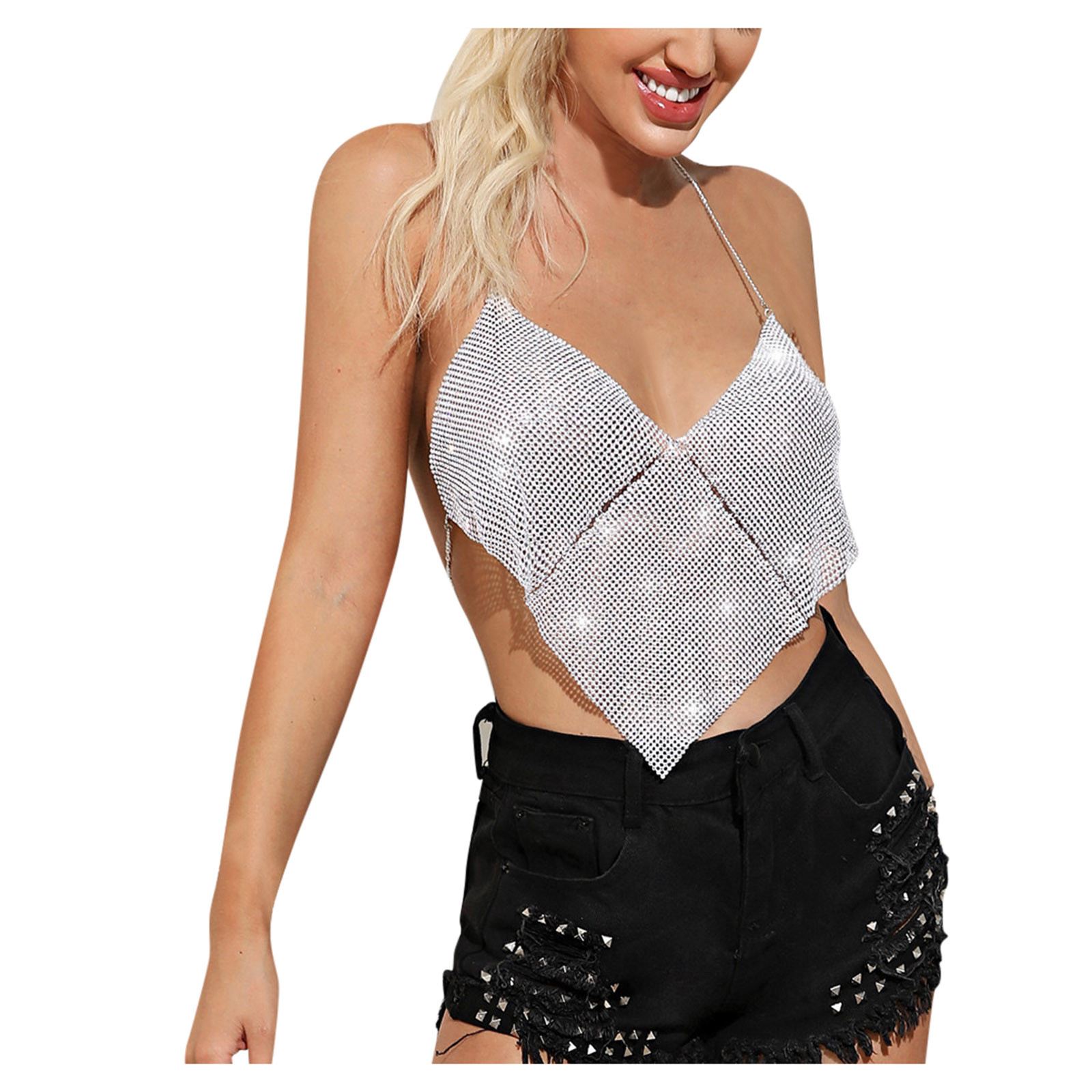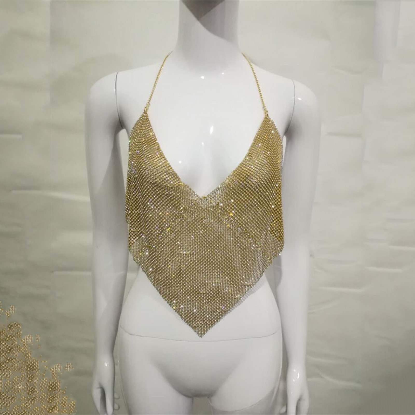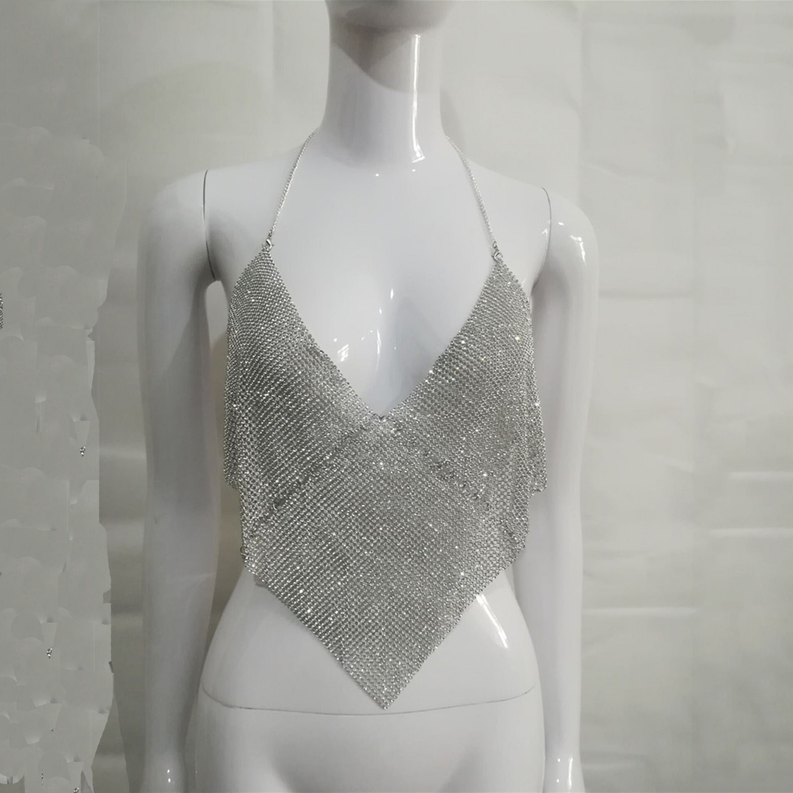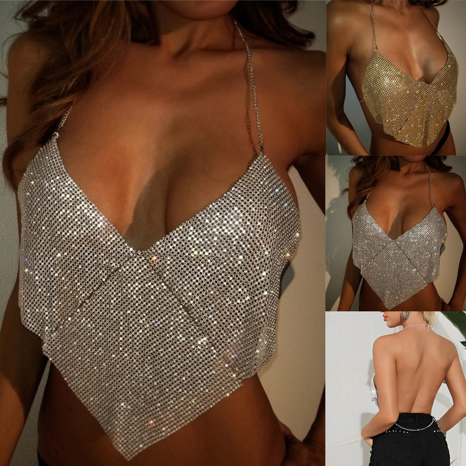 Женский сексуальный жилет, праздничная одежда, блестящие стразы, металлическая цепочка, Холтер, Драпированный бюстгальтер